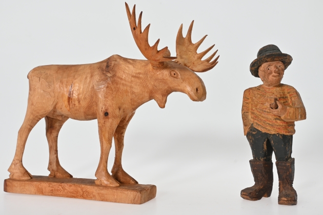 Gubbe signerad Oscar 1937 limmad arm, älg signerad WL limmat horn, höjd 21-26 cm