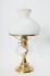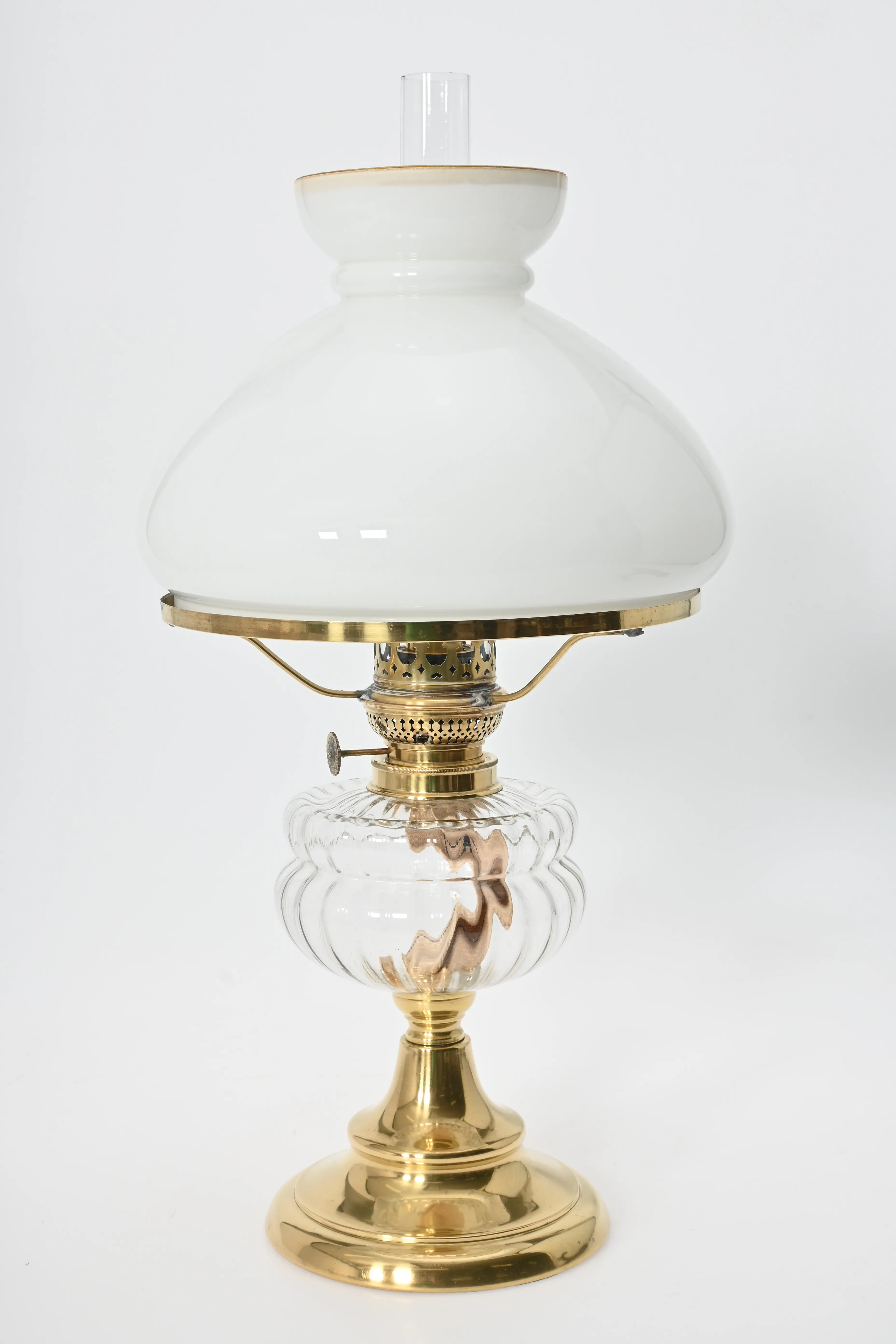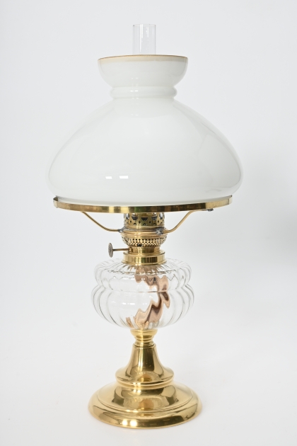 Mässingsfot med oljehus i glas, funktionsduglig, kupan med mindre kantspricka annars fint skick, höjd 52 cm