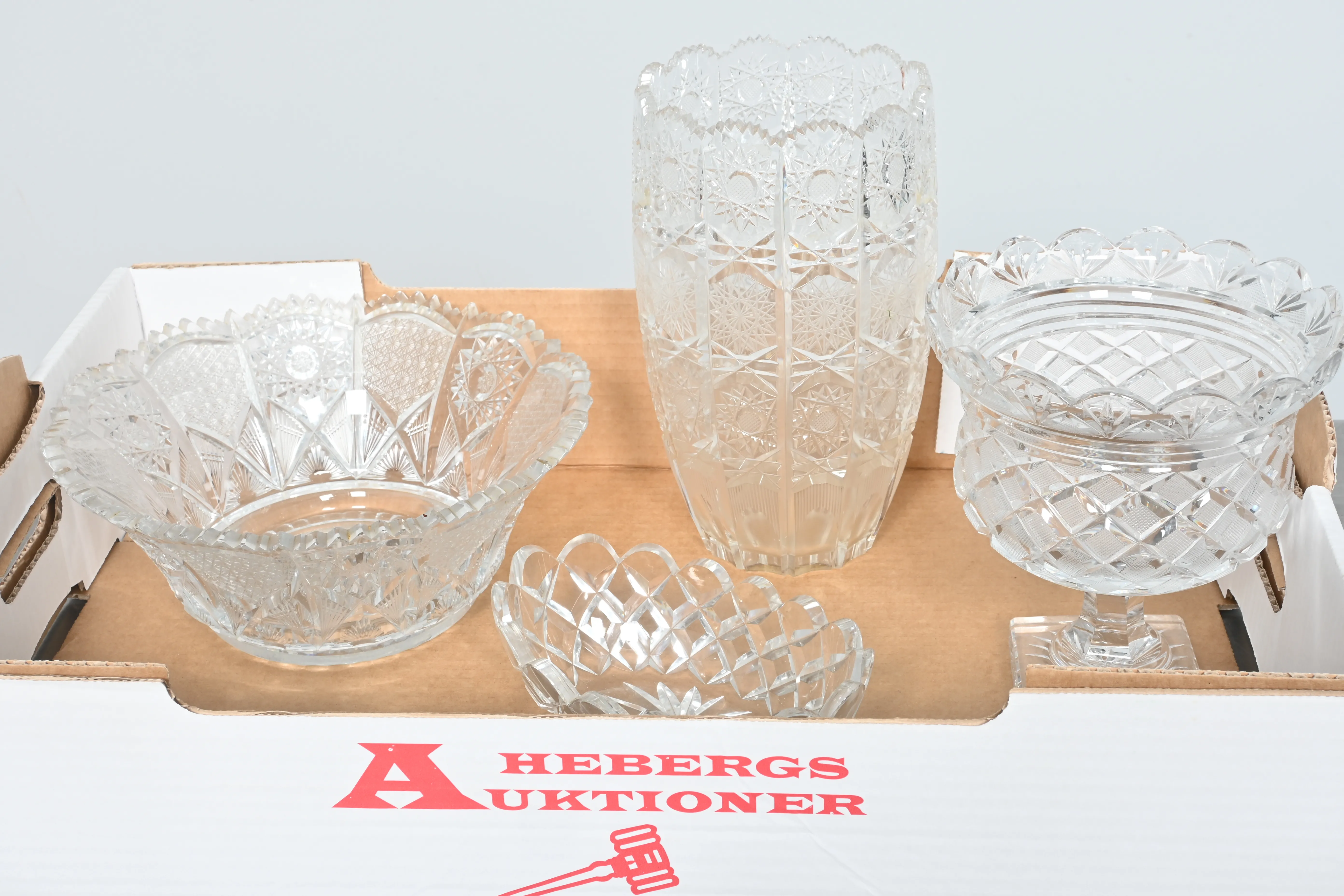Visning: Torsdag 22/1 Kl 16-19 Lördag 24/1 11-14. Utlämning Söndag 25/1 13:00 till 19:30 Måndag 26/1 8-12 och 14-18 Tisdag 27/1 8-12 och 14-16____________________________________________________________________________________________________________________________________________________________________________________________________________- Lägsta möjliga bud är 100 kr. På alla klubbade priser tillkommer Köparprovision 10% och slagavgift på 40 kr per objekt (inklusive moms). Vissa konstföremål kan vara belagda med konstnärsavgift, s.k. Droit de Suite eller följerätt. Betalning och avhämtning av inropade objekt måste ske söndag eller måndagen efter auktionen. Magasineringsavgift kan tillkomma på föremål som inte avhämtas inom angiven tid. Föremål som är betalda och inte hämtade inom två månader skänkes till Lions eller säljes, överskottet efter lagringskostnad skänks till välgörande ändamål. Föremål som säljs på auktion är begagnade och säljs i befintligt skick. Det ankommer på köparen att undersöka föremålen och förvissa sig om skicket. Betalning Du kan betala med kort på "Mina Sidor" via din internetbank, eller med Swish, ange alltid kundnummer. Objektsbeskrivning Objektens beskrivning återspeglar Hebergs Auktioner uppfattning om objekten. Hebergs Auktioner ansvarar inte för skador som förbigåtts vid besiktningen. Hebergs Auktioner ansvarar inte för eventuella felaktigheter i katalogtexten. Bilder i katalogen är till för identifierings- syfte och återspeglar inte nödvändigtvis objektens kondition. Ändringar i katalogtext kan förekomma efter att katalogen tryckts/publicerats. Sent inkomna ändringar meddelas muntligen vid försäljningstillfället. Ur och tekniska föremål säljs som samlarföremål och Hebergs Auktioner kan inte garantera att de är i fungerande skick. Köparens undersökningsplikt gäller. Om Hebergs Auktioner efter begäran från köparen har lämnat en konditionsrapport om ett föremåls kondition skall uppgifterna endast behandlas som vägledning för köparen och befriar inte köparen från dennes undersökningsplikt. Lagen om 14 dagars ångerrätt vid auktionsköp gäller inte här där du har möjlighet att lämna bud på plats. Det framgår av distans- och hemförsäljningslagen ___________________________________________________________________________________________________________________________________________________________________________________________________________________________ Vi kan skicka mindre föremål som inte är ömtåliga med postnord det är postnords prislista över disk som gäller plus moms. Vi skickar inga möbler, tavlor, porslinsföremål, glasföremål m.m