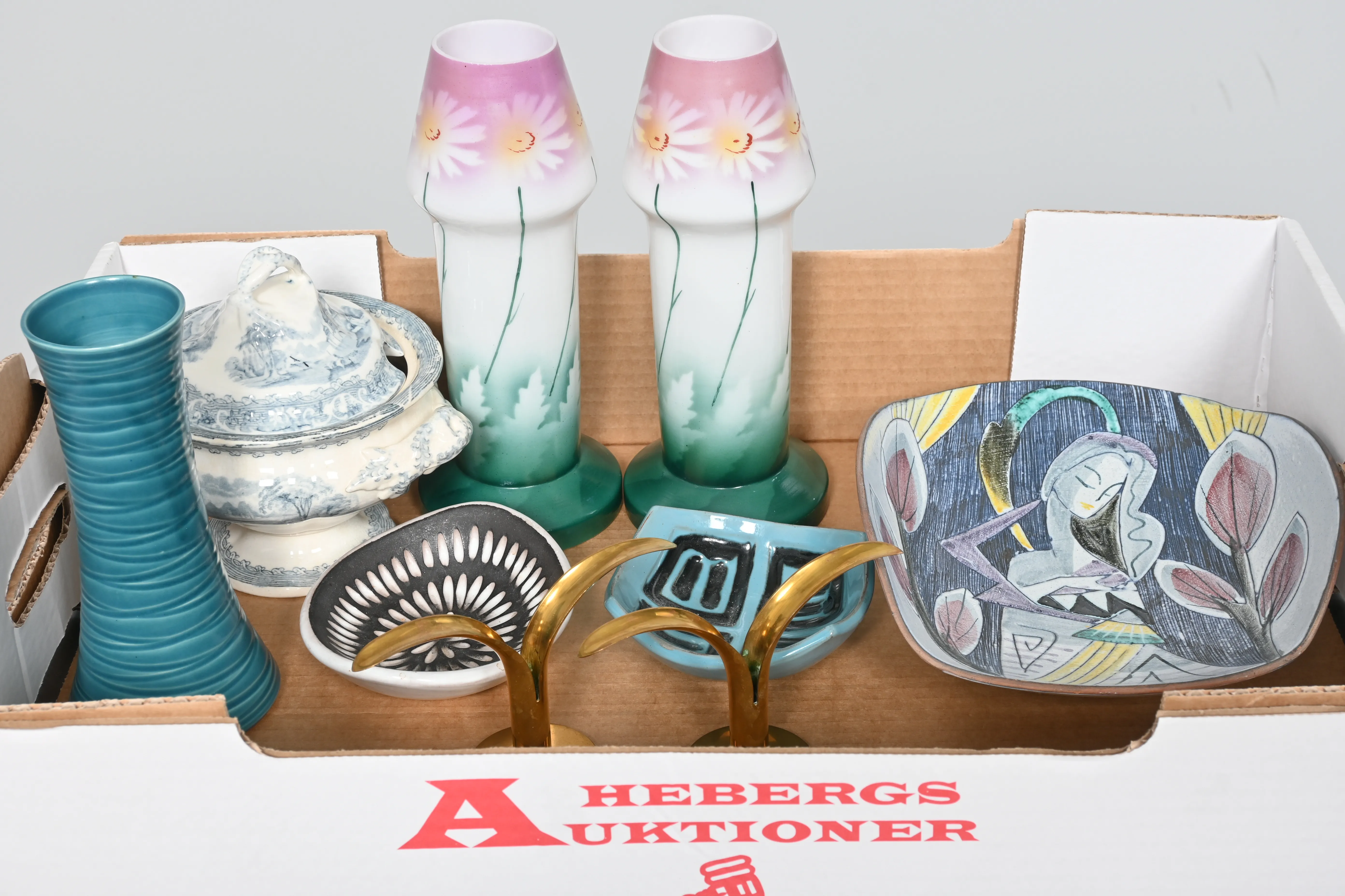 Visning: Torsdag 31/7 Kl 16-19 Lördag 2/8 11-14. Utlämning Söndag 3/8 13:00 till 19:30 Måndag 4/8 8-12 och 14-18 Tisdag 5/8 8-12 och 14-16____________________________________________________________________________________________________________________________________________________________________________________________________________- Lägsta möjliga bud är 100 kr. På alla klubbade priser tillkommer Köparprovision 10% och slagavgift på 40 kr per objekt (inklusive moms). Vissa konstföremål kan vara belagda med konstnärsavgift, s.k. Droit de Suite eller följerätt. Betalning och avhämtning av inropade objekt måste ske söndag eller måndagen efter auktionen. Magasineringsavgift kan tillkomma på föremål som inte avhämtas inom angiven tid. Föremål som är betalda och inte hämtade inom två månader skänkes till Lions eller säljes, överskottet efter lagringskostnad skänks till välgörande ändamål. Föremål som säljs på auktion är begagnade och säljs i befintligt skick. Det ankommer på köparen att undersöka föremålen och förvissa sig om skicket. Betalning Du kan betala med kort på "Mina Sidor" via din internetbank, eller med Swish, ange alltid kundnummer. Objektsbeskrivning Objektens beskrivning återspeglar Hebergs Auktioner uppfattning om objekten. Hebergs Auktioner ansvarar inte för skador som förbigåtts vid besiktningen. Hebergs Auktioner ansvarar inte för eventuella felaktigheter i katalogtexten. Bilder i katalogen är till för identifierings- syfte och återspeglar inte nödvändigtvis objektens kondition. Ändringar i katalogtext kan förekomma efter att katalogen tryckts/publicerats. Sent inkomna ändringar meddelas muntligen vid försäljningstillfället. Ur och tekniska föremål säljs som samlarföremål och Hebergs Auktioner kan inte garantera att de är i fungerande skick. Köparens undersökningsplikt gäller. Om Hebergs Auktioner efter begäran från köparen har lämnat en konditionsrapport om ett föremåls kondition skall uppgifterna endast behandlas som vägledning för köparen och befriar inte köparen från dennes undersökningsplikt. Lagen om 14 dagars ångerrätt vid auktionsköp gäller inte här där du har möjlighet att lämna bud på plats. Det framgår av distans- och hemförsäljningslagen ___________________________________________________________________________________________________________________________________________________________________________________________________________________________ Vi kan skicka mindre föremål som inte är ömtåliga med postnord det är postnords prislista över disk som gäller plus moms. Vid större objekt och ömtåliga saker kan ni kontakta transportfirmorna. ___________________________________________________________________________________________________________________________________________________________________________________________________________________________________________________________________________ Hauges Auktionstransporter Fasta priser inom Sverige och EU. info@hauges.com +46 727 122260 www.hauges.com ___________________________________________________________________________________________________________________________________________________________________________________________________________________________________________________________________________ Vrs Retro Cargo Inforetrocargo@gmail.com 0760677983 Stockholm, Karlstad, Örebro, Malmö, Göteborg ___________________________________________________________________________________________________________________________________________________________________________________________________________________________________________________________________________ JH Packman ApS Nimbusvej 7-9 2670 Greve Tlf: 0045-43735555 Mail: info@jhpackman.dk Web: jhpackman.dk ___________________________________________________________________________________________________________________________________________________________________________________________________________________________________________________________________________ ArtMove Sweden AB Stockholms Frihamn Magasin 6, Entre # 3 Frihamnsgatan 58 115 56 Stockholm Tel 08 450 44 39 Switcboard 08 450 44 60 email : marie@artmove.se www.artmove.se Vi trafikerar Stockholm Göterborg Varberg och Malmö varje vecka där vi kan erbjuda väldigt förmånliga transporter till våra filialer där kunderna själva får hämta sina varor. Vi trafikerar även Köpenhamn London Paris Amsterdam Bryssel och Helsingfors med egna bilar var annan vecka . Vi ordnar även hjälp med kurir flyg och båtfrakt det sköter vi från våra lokaler i Stockholm. __________________________________________________________________________________________________________________________________________________________________________________________________________________________________________________________________________ Falkenbergs Bud & Flyttningsbyrå AB tel: 0346-81639 fax: 0346-16359 email: fbg.flyttningsbyra@outlook.com besöksadress: Cement vägen 3 postadress: Box 290 311 23 FALKENBERG www.budoflytt.com