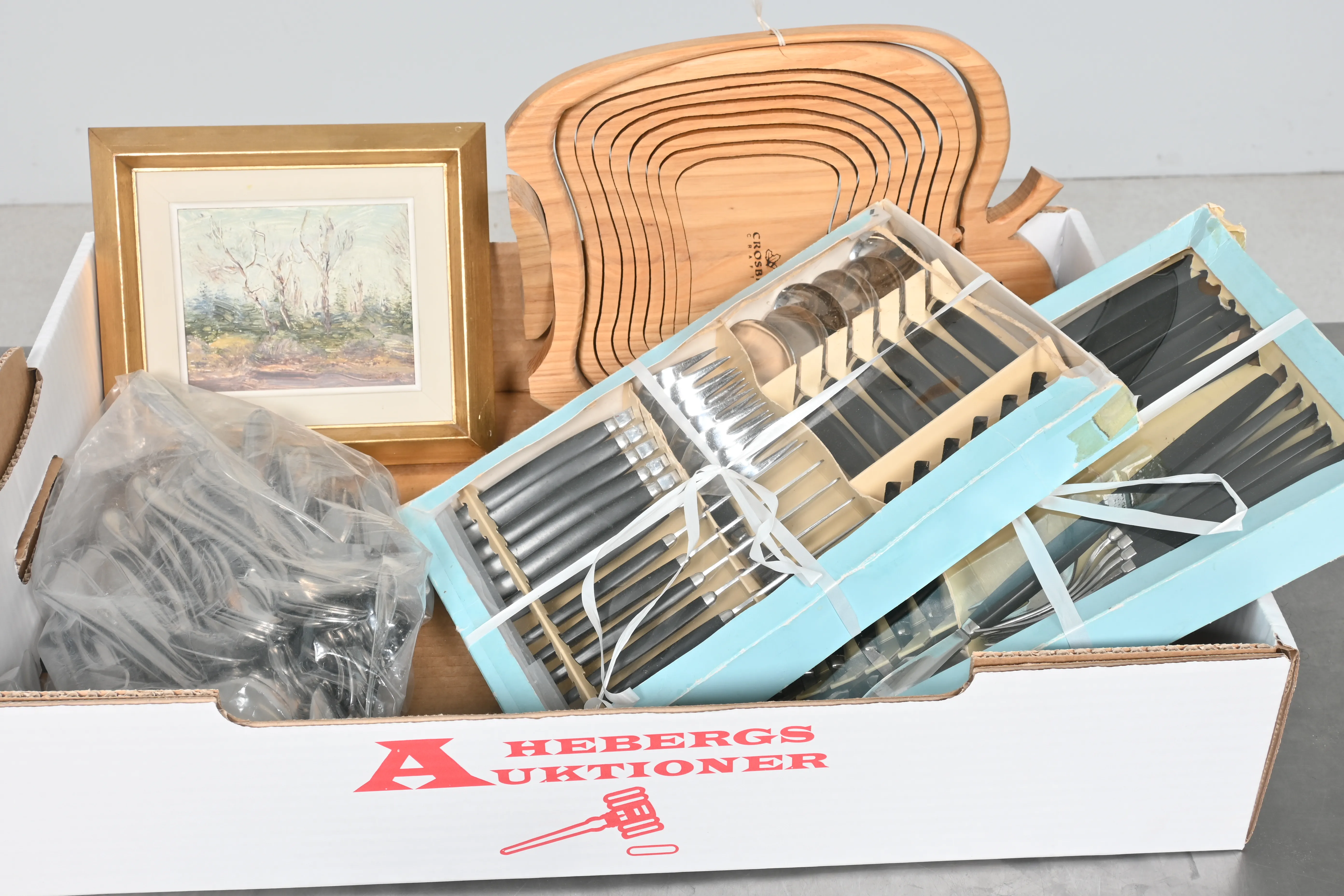 ____________________________________________________________________________________________________________________________________________________________________________________________________________- Lägsta möjliga bud är 100 kr. På alla klubbade priser tillkommer Köparprovision 10% och slagavgift på 40 kr per objekt (inklusive moms). Vissa konstföremål kan vara belagda med konstnärsavgift, s.k. Droit de Suite eller följerätt. Betalning och avhämtning av inropade objekt måste ske söndag eller måndagen efter auktionen. Magasineringsavgift kan tillkomma på föremål som inte avhämtas inom angiven tid. Föremål som är betalda och inte hämtade inom två månader skänkes till Lions eller säljes, överskottet efter lagringskostnad skänks till välgörande ändamål. Föremål som säljs på auktion är begagnade och säljs i befintligt skick. Det ankommer på köparen att undersöka föremålen och förvissa sig om skicket. Betalning Du kan betala med kort på "Mina Sidor" via din internetbank, eller med Swish, ange alltid kundnummer. Objektsbeskrivning Objektens beskrivning återspeglar Hebergs Auktioner uppfattning om objekten. Hebergs Auktioner ansvarar inte för skador som förbigåtts vid besiktningen. Hebergs Auktioner ansvarar inte för eventuella felaktigheter i katalogtexten. Bilder i katalogen är till för identifierings- syfte och återspeglar inte nödvändigtvis objektens kondition. Ändringar i katalogtext kan förekomma efter att katalogen tryckts/publicerats. Sent inkomna ändringar meddelas muntligen vid försäljningstillfället. Ur och tekniska föremål säljs som samlarföremål och Hebergs Auktioner kan inte garantera att de är i fungerande skick. Köparens undersökningsplikt gäller. Om Hebergs Auktioner efter begäran från köparen har lämnat en konditionsrapport om ett föremåls kondition skall uppgifterna endast behandlas som vägledning för köparen och befriar inte köparen från dennes undersökningsplikt. Lagen om 14 dagars ångerrätt vid auktionsköp gäller inte här där du har möjlighet att lämna bud på plats. Det framgår av distans- och hemförsäljningslagen ___________________________________________________________________________________________________________________________________________________________________________________________________________________________ Vi kan skicka mindre föremål som inte är ömtåliga med postnord det är postnords prislista över disk som gäller plus moms. Vi skickar inga möbler, tavlor, porslinsföremål, glasföremål m.m