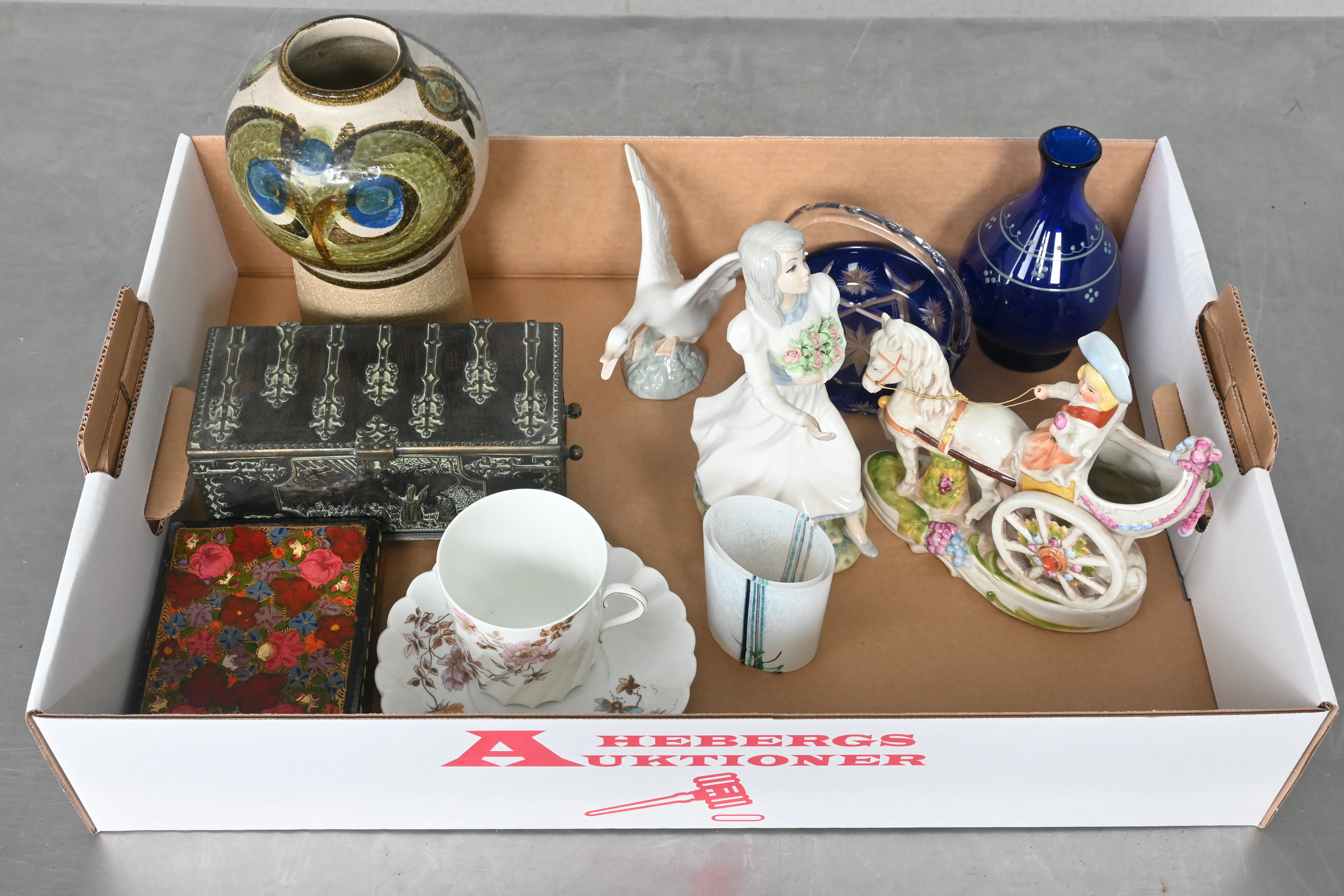 Visning: Torsdag 20/11 Kl 16-19 Lördag 22/11 11-14. Utlämning Söndag 23/11 13:00 till 19:30 Måndag 24/11 8-12 och 14-18 Tisdag 25/11 8-12 och 14-16____________________________________________________________________________________________________________________________________________________________________________________________________________- Lägsta möjliga bud är 100 kr. På alla klubbade priser tillkommer Köparprovision 10% och slagavgift på 40 kr per objekt (inklusive moms). Vissa konstföremål kan vara belagda med konstnärsavgift, s.k. Droit de Suite eller följerätt. Betalning och avhämtning av inropade objekt måste ske söndag eller måndagen efter auktionen. Magasineringsavgift kan tillkomma på föremål som inte avhämtas inom angiven tid. Föremål som är betalda och inte hämtade inom två månader skänkes till Lions eller säljes, överskottet efter lagringskostnad skänks till välgörande ändamål. Föremål som säljs på auktion är begagnade och säljs i befintligt skick. Det ankommer på köparen att undersöka föremålen och förvissa sig om skicket. Betalning Du kan betala med kort på "Mina Sidor" via din internetbank, eller med Swish, ange alltid kundnummer. Objektsbeskrivning Objektens beskrivning återspeglar Hebergs Auktioner uppfattning om objekten. Hebergs Auktioner ansvarar inte för skador som förbigåtts vid besiktningen. Hebergs Auktioner ansvarar inte för eventuella felaktigheter i katalogtexten. Bilder i katalogen är till för identifierings- syfte och återspeglar inte nödvändigtvis objektens kondition. Ändringar i katalogtext kan förekomma efter att katalogen tryckts/publicerats. Sent inkomna ändringar meddelas muntligen vid försäljningstillfället. Ur och tekniska föremål säljs som samlarföremål och Hebergs Auktioner kan inte garantera att de är i fungerande skick. Köparens undersökningsplikt gäller. Om Hebergs Auktioner efter begäran från köparen har lämnat en konditionsrapport om ett föremåls kondition skall uppgifterna endast behandlas som vägledning för köparen och befriar inte köparen från dennes undersökningsplikt. Lagen om 14 dagars ångerrätt vid auktionsköp gäller inte här där du har möjlighet att lämna bud på plats. Det framgår av distans- och hemförsäljningslagen ___________________________________________________________________________________________________________________________________________________________________________________________________________________________ Vi kan skicka mindre föremål som inte är ömtåliga med postnord det är postnords prislista över disk som gäller plus moms. Vi skickar inga möbler, tavlor, porslinsföremål, glasföremål m.m