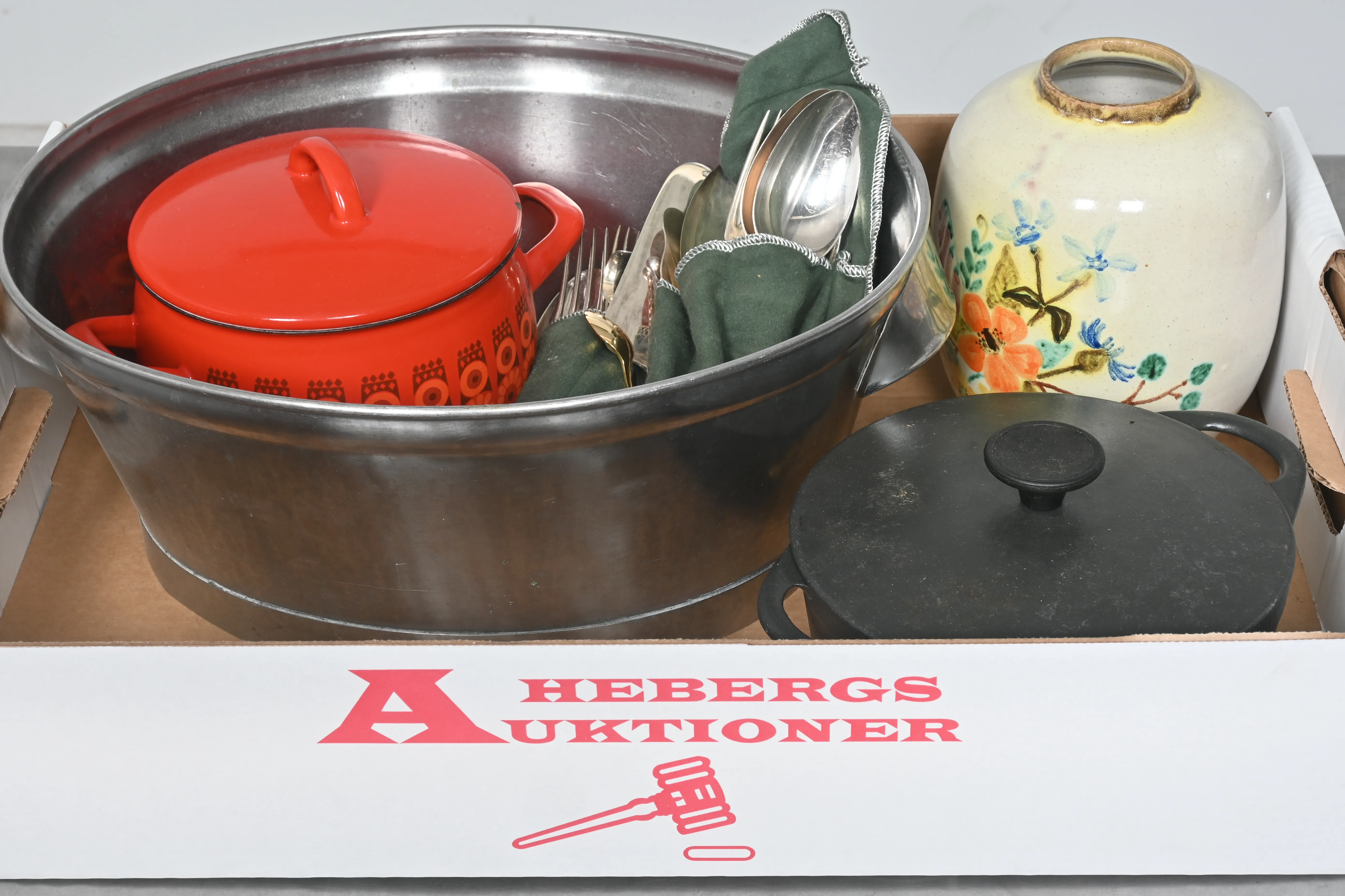 ____________________________________________________________________________________________________________________________________________________________________________________________________________- Lägsta möjliga bud är 100 kr. På alla klubbade priser tillkommer Köparprovision 10% och slagavgift på 40 kr per objekt (inklusive moms). Vissa konstföremål kan vara belagda med konstnärsavgift, s.k. Droit de Suite eller följerätt. Betalning och avhämtning av inropade objekt måste ske söndag eller måndagen efter auktionen. Magasineringsavgift kan tillkomma på föremål som inte avhämtas inom angiven tid. Föremål som är betalda och inte hämtade inom två månader skänkes till Lions eller säljes, överskottet efter lagringskostnad skänks till välgörande ändamål. Föremål som säljs på auktion är begagnade och säljs i befintligt skick. Det ankommer på köparen att undersöka föremålen och förvissa sig om skicket. Betalning Du kan betala med kort på "Mina Sidor" via din internetbank, eller med Swish, ange alltid kundnummer. Objektsbeskrivning Objektens beskrivning återspeglar Hebergs Auktioner uppfattning om objekten. Hebergs Auktioner ansvarar inte för skador som förbigåtts vid besiktningen. Hebergs Auktioner ansvarar inte för eventuella felaktigheter i katalogtexten. Bilder i katalogen är till för identifierings- syfte och återspeglar inte nödvändigtvis objektens kondition. Ändringar i katalogtext kan förekomma efter att katalogen tryckts/publicerats. Sent inkomna ändringar meddelas muntligen vid försäljningstillfället. Ur och tekniska föremål säljs som samlarföremål och Hebergs Auktioner kan inte garantera att de är i fungerande skick. Köparens undersökningsplikt gäller. Om Hebergs Auktioner efter begäran från köparen har lämnat en konditionsrapport om ett föremåls kondition skall uppgifterna endast behandlas som vägledning för köparen och befriar inte köparen från dennes undersökningsplikt. Lagen om 14 dagars ångerrätt vid auktionsköp gäller inte här där du har möjlighet att lämna bud på plats. Det framgår av distans- och hemförsäljningslagen ___________________________________________________________________________________________________________________________________________________________________________________________________________________________ Vi kan skicka mindre föremål som inte är ömtåliga med postnord det är postnords prislista över disk som gäller plus moms. Vi skickar inga möbler, tavlor, porslinsföremål, glasföremål m.m