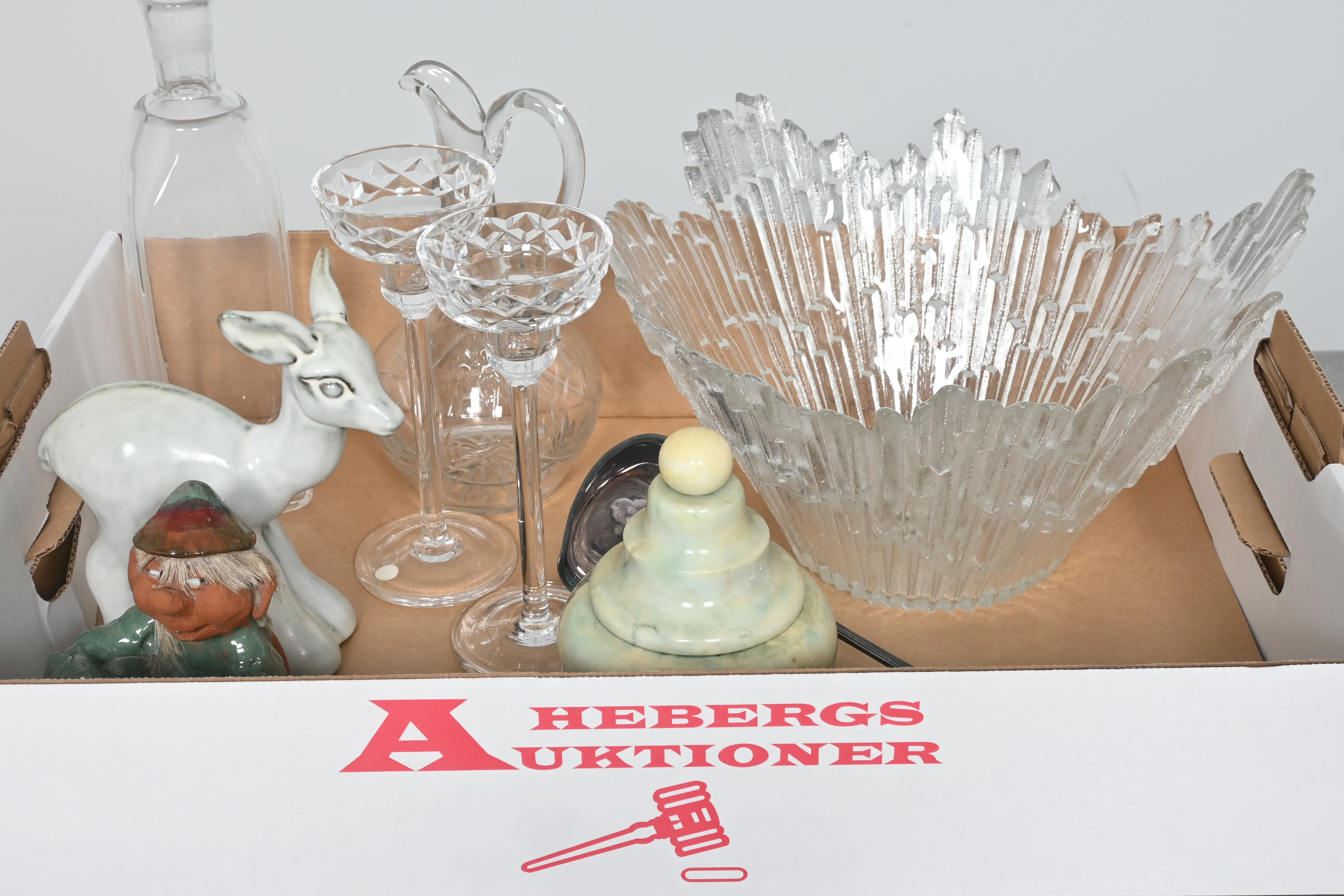 Visning: Torsdag 20/11 Kl 16-19 Lördag 22/11 11-14. Utlämning Söndag 23/11 13:00 till 19:30 Måndag 24/11 8-12 och 14-18 Tisdag 25/11 8-12 och 14-16____________________________________________________________________________________________________________________________________________________________________________________________________________- Lägsta möjliga bud är 100 kr. På alla klubbade priser tillkommer Köparprovision 10% och slagavgift på 40 kr per objekt (inklusive moms). Vissa konstföremål kan vara belagda med konstnärsavgift, s.k. Droit de Suite eller följerätt. Betalning och avhämtning av inropade objekt måste ske söndag eller måndagen efter auktionen. Magasineringsavgift kan tillkomma på föremål som inte avhämtas inom angiven tid. Föremål som är betalda och inte hämtade inom två månader skänkes till Lions eller säljes, överskottet efter lagringskostnad skänks till välgörande ändamål. Föremål som säljs på auktion är begagnade och säljs i befintligt skick. Det ankommer på köparen att undersöka föremålen och förvissa sig om skicket. Betalning Du kan betala med kort på "Mina Sidor" via din internetbank, eller med Swish, ange alltid kundnummer. Objektsbeskrivning Objektens beskrivning återspeglar Hebergs Auktioner uppfattning om objekten. Hebergs Auktioner ansvarar inte för skador som förbigåtts vid besiktningen. Hebergs Auktioner ansvarar inte för eventuella felaktigheter i katalogtexten. Bilder i katalogen är till för identifierings- syfte och återspeglar inte nödvändigtvis objektens kondition. Ändringar i katalogtext kan förekomma efter att katalogen tryckts/publicerats. Sent inkomna ändringar meddelas muntligen vid försäljningstillfället. Ur och tekniska föremål säljs som samlarföremål och Hebergs Auktioner kan inte garantera att de är i fungerande skick. Köparens undersökningsplikt gäller. Om Hebergs Auktioner efter begäran från köparen har lämnat en konditionsrapport om ett föremåls kondition skall uppgifterna endast behandlas som vägledning för köparen och befriar inte köparen från dennes undersökningsplikt. Lagen om 14 dagars ångerrätt vid auktionsköp gäller inte här där du har möjlighet att lämna bud på plats. Det framgår av distans- och hemförsäljningslagen ___________________________________________________________________________________________________________________________________________________________________________________________________________________________ Vi kan skicka mindre föremål som inte är ömtåliga med postnord det är postnords prislista över disk som gäller plus moms. Vi skickar inga möbler, tavlor, porslinsföremål, glasföremål m.m
