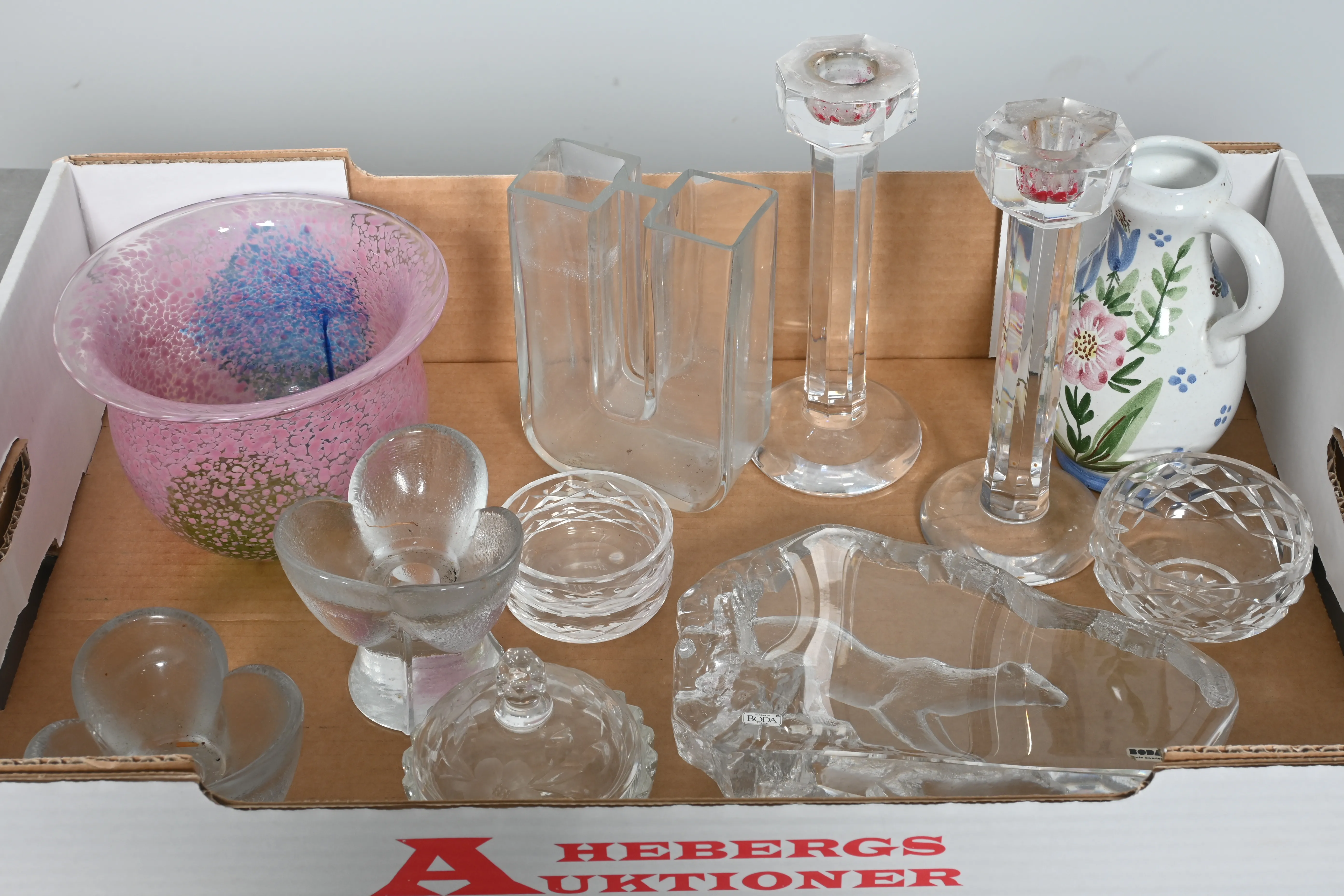 ____________________________________________________________________________________________________________________________________________________________________________________________________________- Lägsta möjliga bud är 100 kr. På alla klubbade priser tillkommer Köparprovision 10% och slagavgift på 40 kr per objekt (inklusive moms). Vissa konstföremål kan vara belagda med konstnärsavgift, s.k. Droit de Suite eller följerätt. Betalning och avhämtning av inropade objekt måste ske söndag eller måndagen efter auktionen. Magasineringsavgift kan tillkomma på föremål som inte avhämtas inom angiven tid. Föremål som är betalda och inte hämtade inom två månader skänkes till Lions eller säljes, överskottet efter lagringskostnad skänks till välgörande ändamål. Föremål som säljs på auktion är begagnade och säljs i befintligt skick. Det ankommer på köparen att undersöka föremålen och förvissa sig om skicket. Betalning Du kan betala med kort på "Mina Sidor" via din internetbank, eller med Swish, ange alltid kundnummer. Objektsbeskrivning Objektens beskrivning återspeglar Hebergs Auktioner uppfattning om objekten. Hebergs Auktioner ansvarar inte för skador som förbigåtts vid besiktningen. Hebergs Auktioner ansvarar inte för eventuella felaktigheter i katalogtexten. Bilder i katalogen är till för identifierings- syfte och återspeglar inte nödvändigtvis objektens kondition. Ändringar i katalogtext kan förekomma efter att katalogen tryckts/publicerats. Sent inkomna ändringar meddelas muntligen vid försäljningstillfället. Ur och tekniska föremål säljs som samlarföremål och Hebergs Auktioner kan inte garantera att de är i fungerande skick. Köparens undersökningsplikt gäller. Om Hebergs Auktioner efter begäran från köparen har lämnat en konditionsrapport om ett föremåls kondition skall uppgifterna endast behandlas som vägledning för köparen och befriar inte köparen från dennes undersökningsplikt. Lagen om 14 dagars ångerrätt vid auktionsköp gäller inte här där du har möjlighet att lämna bud på plats. Det framgår av distans- och hemförsäljningslagen ___________________________________________________________________________________________________________________________________________________________________________________________________________________________ Vi kan skicka mindre föremål som inte är ömtåliga med postnord det är postnords prislista över disk som gäller plus moms. Vi skickar inga möbler, tavlor, porslinsföremål, glasföremål m.m