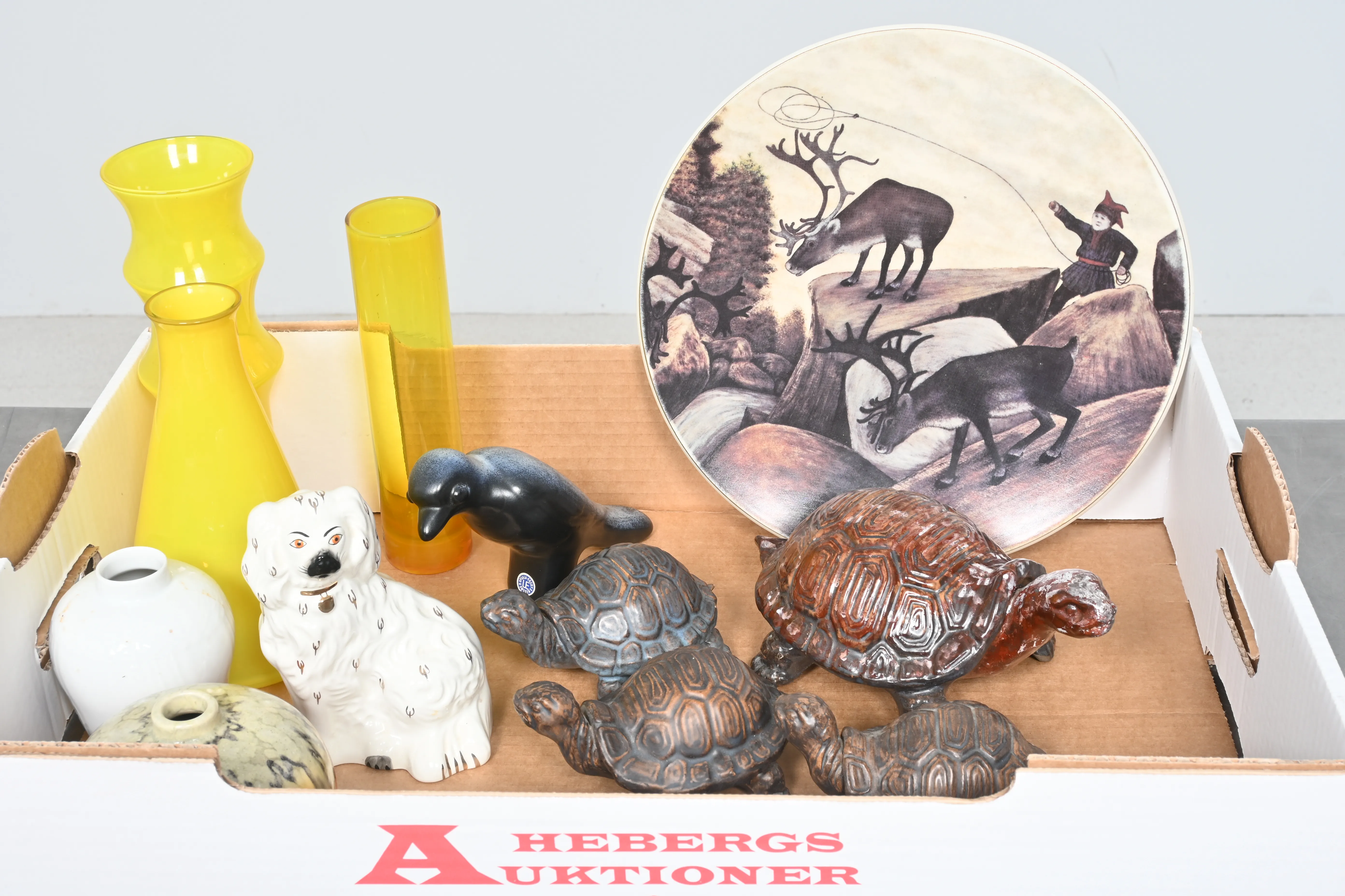 Visning: Torsdag 22/1 Kl 16-19 Lördag 24/1 11-14. Utlämning Söndag 25/1 13:00 till 19:30 Måndag 26/11 8-12 och 14-18 Tisdag 27/11 8-12 och 14-16____________________________________________________________________________________________________________________________________________________________________________________________________________- Lägsta möjliga bud är 100 kr. På alla klubbade priser tillkommer Köparprovision 10% och slagavgift på 40 kr per objekt (inklusive moms). Vissa konstföremål kan vara belagda med konstnärsavgift, s.k. Droit de Suite eller följerätt. Betalning och avhämtning av inropade objekt måste ske söndag eller måndagen efter auktionen. Magasineringsavgift kan tillkomma på föremål som inte avhämtas inom angiven tid. Föremål som är betalda och inte hämtade inom två månader skänkes till Lions eller säljes, överskottet efter lagringskostnad skänks till välgörande ändamål. Föremål som säljs på auktion är begagnade och säljs i befintligt skick. Det ankommer på köparen att undersöka föremålen och förvissa sig om skicket. Betalning Du kan betala med kort på "Mina Sidor" via din internetbank, eller med Swish, ange alltid kundnummer. Objektsbeskrivning Objektens beskrivning återspeglar Hebergs Auktioner uppfattning om objekten. Hebergs Auktioner ansvarar inte för skador som förbigåtts vid besiktningen. Hebergs Auktioner ansvarar inte för eventuella felaktigheter i katalogtexten. Bilder i katalogen är till för identifierings- syfte och återspeglar inte nödvändigtvis objektens kondition. Ändringar i katalogtext kan förekomma efter att katalogen tryckts/publicerats. Sent inkomna ändringar meddelas muntligen vid försäljningstillfället. Ur och tekniska föremål säljs som samlarföremål och Hebergs Auktioner kan inte garantera att de är i fungerande skick. Köparens undersökningsplikt gäller. Om Hebergs Auktioner efter begäran från köparen har lämnat en konditionsrapport om ett föremåls kondition skall uppgifterna endast behandlas som vägledning för köparen och befriar inte köparen från dennes undersökningsplikt. Lagen om 14 dagars ångerrätt vid auktionsköp gäller inte här där du har möjlighet att lämna bud på plats. Det framgår av distans- och hemförsäljningslagen ___________________________________________________________________________________________________________________________________________________________________________________________________________________________ Vi kan skicka mindre föremål som inte är ömtåliga med postnord det är postnords prislista över disk som gäller plus moms. Vi skickar inga möbler, tavlor, porslinsföremål, glasföremål m.m