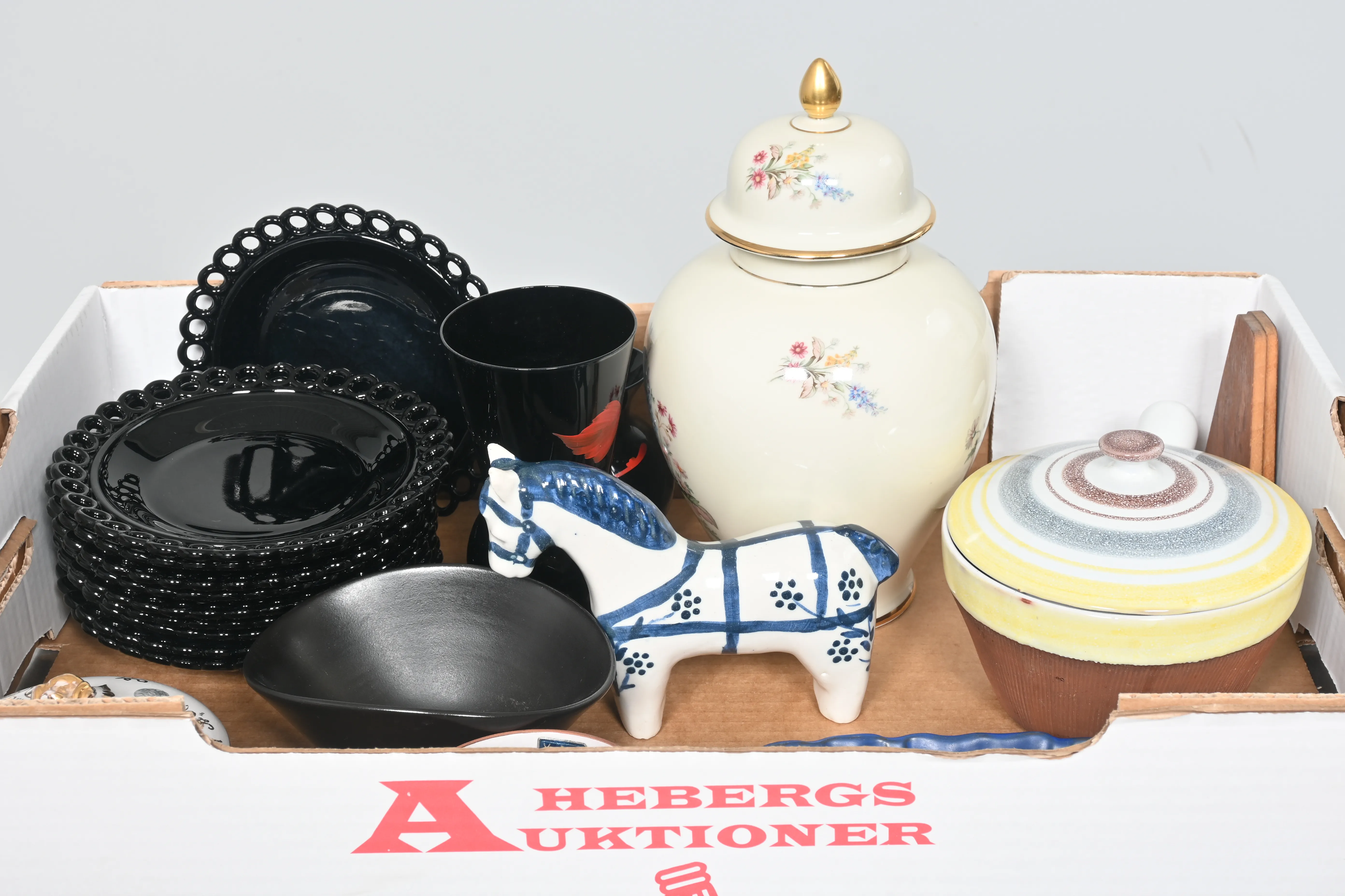 Visning: Torsdag 22/1 Kl 16-19 Lördag 24/1 11-14. Utlämning Söndag 25/1 13:00 till 19:30 Måndag 26/1 8-12 och 14-18 Tisdag 27/1 8-12 och 14-16____________________________________________________________________________________________________________________________________________________________________________________________________________- Lägsta möjliga bud är 100 kr. På alla klubbade priser tillkommer Köparprovision 10% och slagavgift på 40 kr per objekt (inklusive moms). Vissa konstföremål kan vara belagda med konstnärsavgift, s.k. Droit de Suite eller följerätt. Betalning och avhämtning av inropade objekt måste ske söndag eller måndagen efter auktionen. Magasineringsavgift kan tillkomma på föremål som inte avhämtas inom angiven tid. Föremål som är betalda och inte hämtade inom två månader skänkes till Lions eller säljes, överskottet efter lagringskostnad skänks till välgörande ändamål. Föremål som säljs på auktion är begagnade och säljs i befintligt skick. Det ankommer på köparen att undersöka föremålen och förvissa sig om skicket. Betalning Du kan betala med kort på "Mina Sidor" via din internetbank, eller med Swish, ange alltid kundnummer. Objektsbeskrivning Objektens beskrivning återspeglar Hebergs Auktioner uppfattning om objekten. Hebergs Auktioner ansvarar inte för skador som förbigåtts vid besiktningen. Hebergs Auktioner ansvarar inte för eventuella felaktigheter i katalogtexten. Bilder i katalogen är till för identifierings- syfte och återspeglar inte nödvändigtvis objektens kondition. Ändringar i katalogtext kan förekomma efter att katalogen tryckts/publicerats. Sent inkomna ändringar meddelas muntligen vid försäljningstillfället. Ur och tekniska föremål säljs som samlarföremål och Hebergs Auktioner kan inte garantera att de är i fungerande skick. Köparens undersökningsplikt gäller. Om Hebergs Auktioner efter begäran från köparen har lämnat en konditionsrapport om ett föremåls kondition skall uppgifterna endast behandlas som vägledning för köparen och befriar inte köparen från dennes undersökningsplikt. Lagen om 14 dagars ångerrätt vid auktionsköp gäller inte här där du har möjlighet att lämna bud på plats. Det framgår av distans- och hemförsäljningslagen ___________________________________________________________________________________________________________________________________________________________________________________________________________________________ Vi kan skicka mindre föremål som inte är ömtåliga med postnord det är postnords prislista över disk som gäller plus moms. Vi skickar inga möbler, tavlor, porslinsföremål, glasföremål m.m