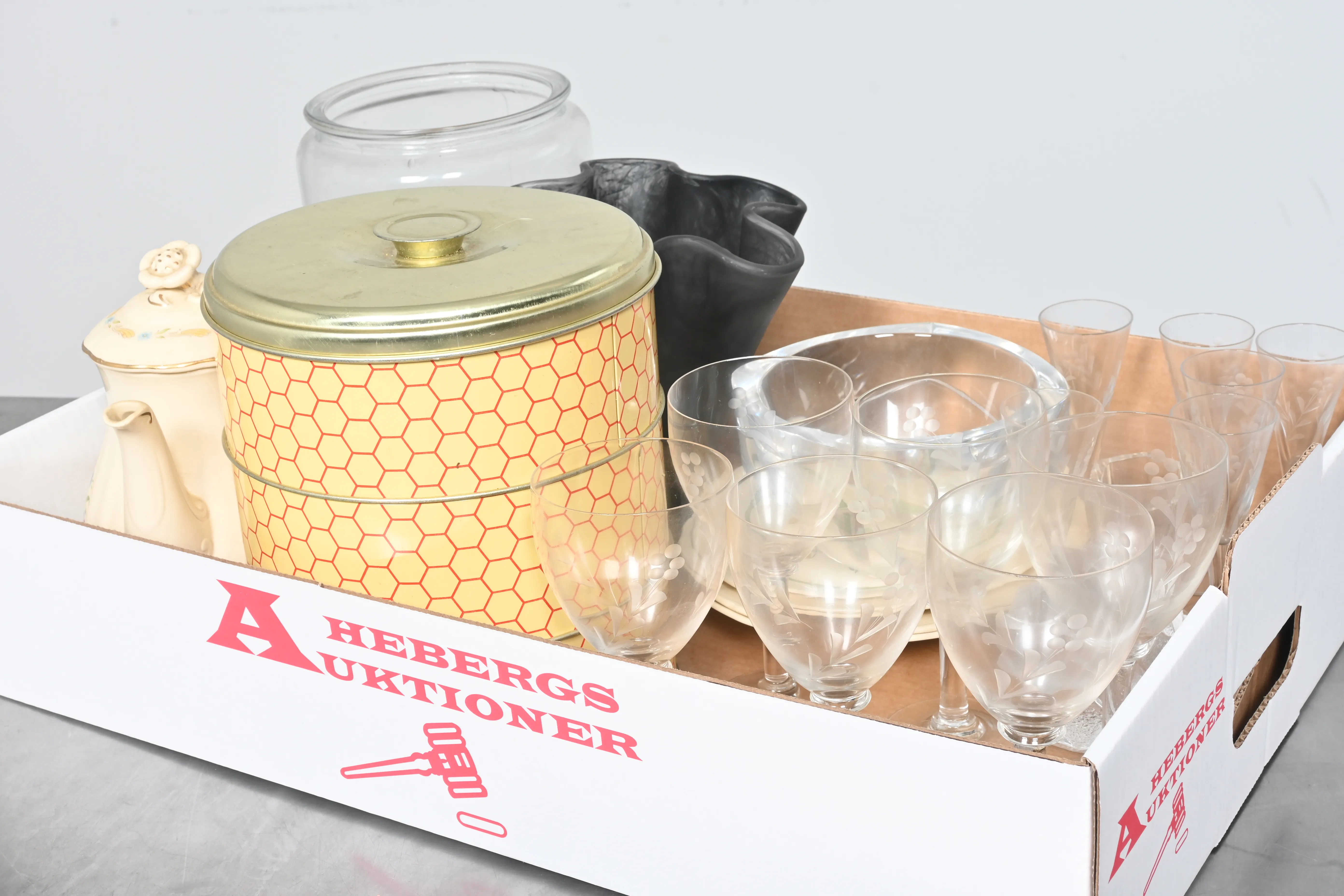 Visning: Torsdag 22/1 Kl 16-19 Lördag 24/1 11-14. Utlämning Söndag 25/1 13:00 till 19:30 Måndag 26/1 8-12 och 14-18 Tisdag 27/1 8-12 och 14-16____________________________________________________________________________________________________________________________________________________________________________________________________________- Lägsta möjliga bud är 100 kr. På alla klubbade priser tillkommer Köparprovision 10% och slagavgift på 40 kr per objekt (inklusive moms). Vissa konstföremål kan vara belagda med konstnärsavgift, s.k. Droit de Suite eller följerätt. Betalning och avhämtning av inropade objekt måste ske söndag eller måndagen efter auktionen. Magasineringsavgift kan tillkomma på föremål som inte avhämtas inom angiven tid. Föremål som är betalda och inte hämtade inom två månader skänkes till Lions eller säljes, överskottet efter lagringskostnad skänks till välgörande ändamål. Föremål som säljs på auktion är begagnade och säljs i befintligt skick. Det ankommer på köparen att undersöka föremålen och förvissa sig om skicket. Betalning Du kan betala med kort på "Mina Sidor" via din internetbank, eller med Swish, ange alltid kundnummer. Objektsbeskrivning Objektens beskrivning återspeglar Hebergs Auktioner uppfattning om objekten. Hebergs Auktioner ansvarar inte för skador som förbigåtts vid besiktningen. Hebergs Auktioner ansvarar inte för eventuella felaktigheter i katalogtexten. Bilder i katalogen är till för identifierings- syfte och återspeglar inte nödvändigtvis objektens kondition. Ändringar i katalogtext kan förekomma efter att katalogen tryckts/publicerats. Sent inkomna ändringar meddelas muntligen vid försäljningstillfället. Ur och tekniska föremål säljs som samlarföremål och Hebergs Auktioner kan inte garantera att de är i fungerande skick. Köparens undersökningsplikt gäller. Om Hebergs Auktioner efter begäran från köparen har lämnat en konditionsrapport om ett föremåls kondition skall uppgifterna endast behandlas som vägledning för köparen och befriar inte köparen från dennes undersökningsplikt. Lagen om 14 dagars ångerrätt vid auktionsköp gäller inte här där du har möjlighet att lämna bud på plats. Det framgår av distans- och hemförsäljningslagen ___________________________________________________________________________________________________________________________________________________________________________________________________________________________ Vi kan skicka mindre föremål som inte är ömtåliga med postnord det är postnords prislista över disk som gäller plus moms. Vi skickar inga möbler, tavlor, porslinsföremål, glasföremål m.m