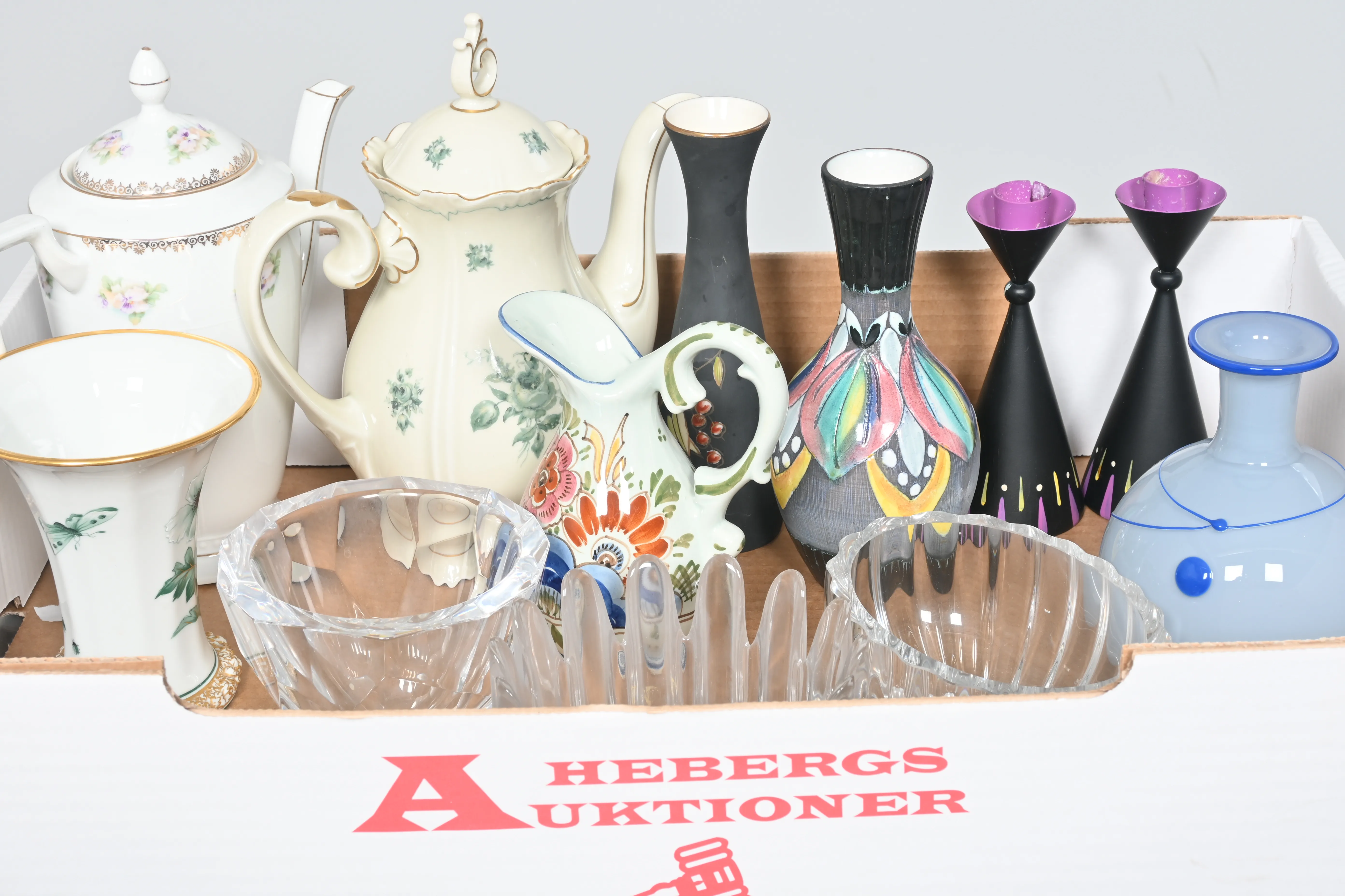Visning: Torsdag 22/1 Kl 16-19 Lördag 24/1 11-14. Utlämning Söndag 25/1 13:00 till 19:30 Måndag 26/1 8-12 och 14-18 Tisdag 27/1 8-12 och 14-16____________________________________________________________________________________________________________________________________________________________________________________________________________- Lägsta möjliga bud är 100 kr. På alla klubbade priser tillkommer Köparprovision 10% och slagavgift på 40 kr per objekt (inklusive moms). Vissa konstföremål kan vara belagda med konstnärsavgift, s.k. Droit de Suite eller följerätt. Betalning och avhämtning av inropade objekt måste ske söndag eller måndagen efter auktionen. Magasineringsavgift kan tillkomma på föremål som inte avhämtas inom angiven tid. Föremål som är betalda och inte hämtade inom två månader skänkes till Lions eller säljes, överskottet efter lagringskostnad skänks till välgörande ändamål. Föremål som säljs på auktion är begagnade och säljs i befintligt skick. Det ankommer på köparen att undersöka föremålen och förvissa sig om skicket. Betalning Du kan betala med kort på "Mina Sidor" via din internetbank, eller med Swish, ange alltid kundnummer. Objektsbeskrivning Objektens beskrivning återspeglar Hebergs Auktioner uppfattning om objekten. Hebergs Auktioner ansvarar inte för skador som förbigåtts vid besiktningen. Hebergs Auktioner ansvarar inte för eventuella felaktigheter i katalogtexten. Bilder i katalogen är till för identifierings- syfte och återspeglar inte nödvändigtvis objektens kondition. Ändringar i katalogtext kan förekomma efter att katalogen tryckts/publicerats. Sent inkomna ändringar meddelas muntligen vid försäljningstillfället. Ur och tekniska föremål säljs som samlarföremål och Hebergs Auktioner kan inte garantera att de är i fungerande skick. Köparens undersökningsplikt gäller. Om Hebergs Auktioner efter begäran från köparen har lämnat en konditionsrapport om ett föremåls kondition skall uppgifterna endast behandlas som vägledning för köparen och befriar inte köparen från dennes undersökningsplikt. Lagen om 14 dagars ångerrätt vid auktionsköp gäller inte här där du har möjlighet att lämna bud på plats. Det framgår av distans- och hemförsäljningslagen ___________________________________________________________________________________________________________________________________________________________________________________________________________________________ Vi kan skicka mindre föremål som inte är ömtåliga med postnord det är postnords prislista över disk som gäller plus moms. Vi skickar inga möbler, tavlor, porslinsföremål, glasföremål m.m