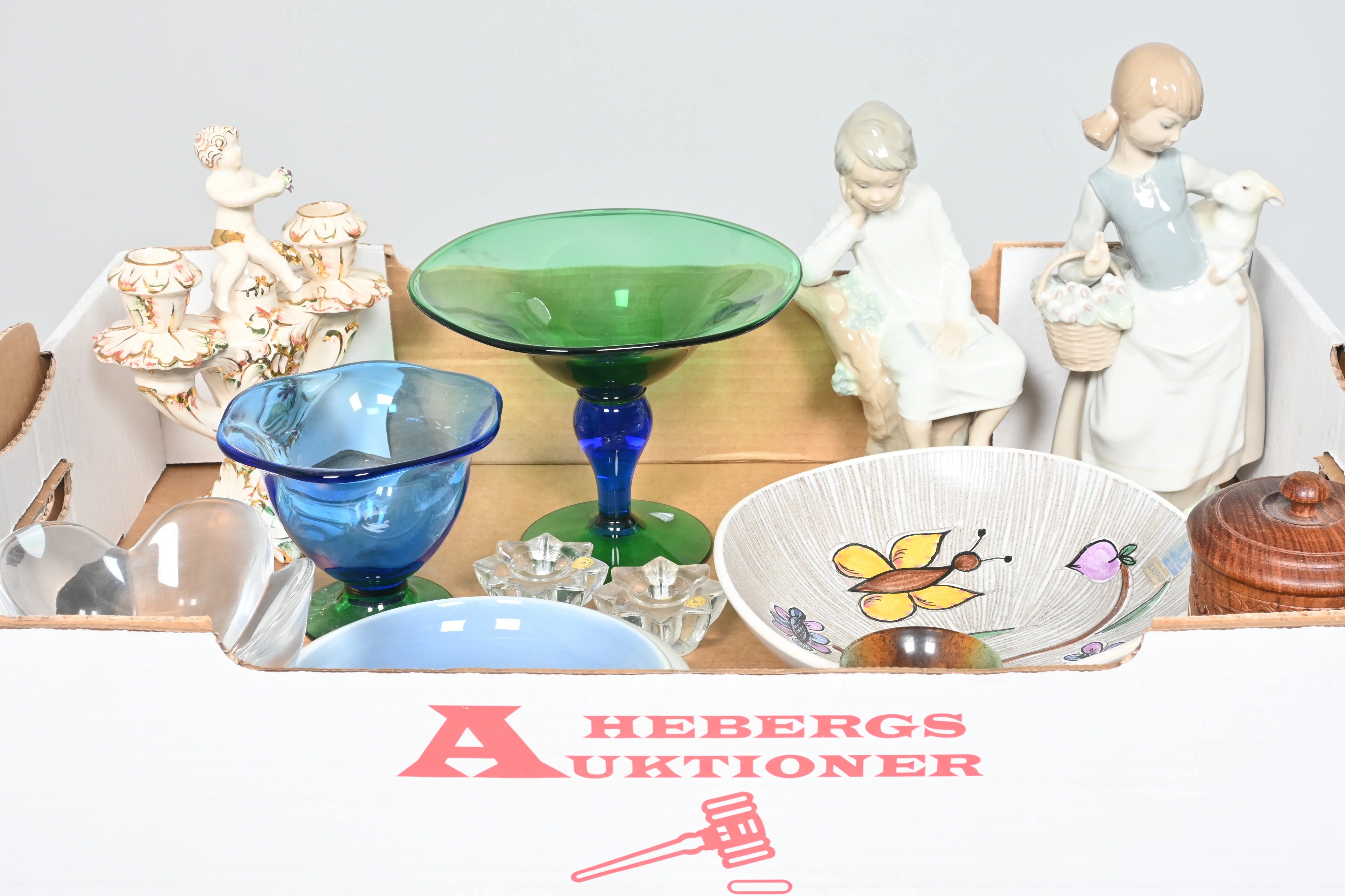 Visning: Torsdag 22/1 Kl 16-19 Lördag 24/1 11-14. Utlämning Söndag 25/1 13:00 till 19:30 Måndag 26/1 8-12 och 14-18 Tisdag 27/1 8-12 och 14-16____________________________________________________________________________________________________________________________________________________________________________________________________________- Lägsta möjliga bud är 100 kr. På alla klubbade priser tillkommer Köparprovision 10% och slagavgift på 40 kr per objekt (inklusive moms). Vissa konstföremål kan vara belagda med konstnärsavgift, s.k. Droit de Suite eller följerätt. Betalning och avhämtning av inropade objekt måste ske söndag eller måndagen efter auktionen. Magasineringsavgift kan tillkomma på föremål som inte avhämtas inom angiven tid. Föremål som är betalda och inte hämtade inom två månader skänkes till Lions eller säljes, överskottet efter lagringskostnad skänks till välgörande ändamål. Föremål som säljs på auktion är begagnade och säljs i befintligt skick. Det ankommer på köparen att undersöka föremålen och förvissa sig om skicket. Betalning Du kan betala med kort på "Mina Sidor" via din internetbank, eller med Swish, ange alltid kundnummer. Objektsbeskrivning Objektens beskrivning återspeglar Hebergs Auktioner uppfattning om objekten. Hebergs Auktioner ansvarar inte för skador som förbigåtts vid besiktningen. Hebergs Auktioner ansvarar inte för eventuella felaktigheter i katalogtexten. Bilder i katalogen är till för identifierings- syfte och återspeglar inte nödvändigtvis objektens kondition. Ändringar i katalogtext kan förekomma efter att katalogen tryckts/publicerats. Sent inkomna ändringar meddelas muntligen vid försäljningstillfället. Ur och tekniska föremål säljs som samlarföremål och Hebergs Auktioner kan inte garantera att de är i fungerande skick. Köparens undersökningsplikt gäller. Om Hebergs Auktioner efter begäran från köparen har lämnat en konditionsrapport om ett föremåls kondition skall uppgifterna endast behandlas som vägledning för köparen och befriar inte köparen från dennes undersökningsplikt. Lagen om 14 dagars ångerrätt vid auktionsköp gäller inte här där du har möjlighet att lämna bud på plats. Det framgår av distans- och hemförsäljningslagen ___________________________________________________________________________________________________________________________________________________________________________________________________________________________ Vi kan skicka mindre föremål som inte är ömtåliga med postnord det är postnords prislista över disk som gäller plus moms. Vi skickar inga möbler, tavlor, porslinsföremål, glasföremål m.m