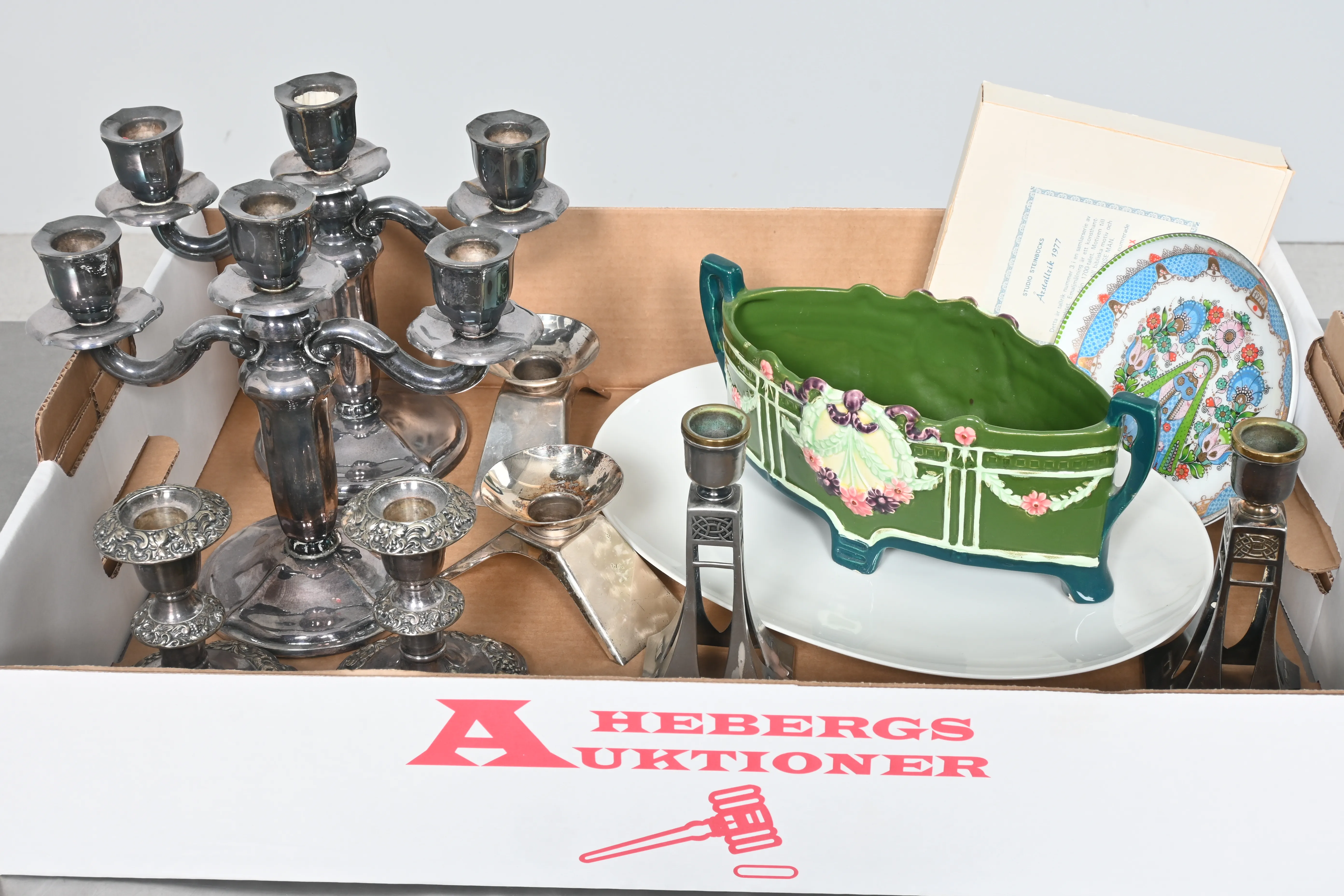 ____________________________________________________________________________________________________________________________________________________________________________________________________________- Lägsta möjliga bud är 100 kr. På alla klubbade priser tillkommer Köparprovision 10% och slagavgift på 40 kr per objekt (inklusive moms). Vissa konstföremål kan vara belagda med konstnärsavgift, s.k. Droit de Suite eller följerätt. Betalning och avhämtning av inropade objekt måste ske söndag eller måndagen efter auktionen. Magasineringsavgift kan tillkomma på föremål som inte avhämtas inom angiven tid. Föremål som är betalda och inte hämtade inom två månader skänkes till Lions eller säljes, överskottet efter lagringskostnad skänks till välgörande ändamål. Föremål som säljs på auktion är begagnade och säljs i befintligt skick. Det ankommer på köparen att undersöka föremålen och förvissa sig om skicket. Betalning Du kan betala med kort på "Mina Sidor" via din internetbank, eller med Swish, ange alltid kundnummer. Objektsbeskrivning Objektens beskrivning återspeglar Hebergs Auktioner uppfattning om objekten. Hebergs Auktioner ansvarar inte för skador som förbigåtts vid besiktningen. Hebergs Auktioner ansvarar inte för eventuella felaktigheter i katalogtexten. Bilder i katalogen är till för identifierings- syfte och återspeglar inte nödvändigtvis objektens kondition. Ändringar i katalogtext kan förekomma efter att katalogen tryckts/publicerats. Sent inkomna ändringar meddelas muntligen vid försäljningstillfället. Ur och tekniska föremål säljs som samlarföremål och Hebergs Auktioner kan inte garantera att de är i fungerande skick. Köparens undersökningsplikt gäller. Om Hebergs Auktioner efter begäran från köparen har lämnat en konditionsrapport om ett föremåls kondition skall uppgifterna endast behandlas som vägledning för köparen och befriar inte köparen från dennes undersökningsplikt. Lagen om 14 dagars ångerrätt vid auktionsköp gäller inte här där du har möjlighet att lämna bud på plats. Det framgår av distans- och hemförsäljningslagen ___________________________________________________________________________________________________________________________________________________________________________________________________________________________ Vi kan skicka mindre föremål som inte är ömtåliga med postnord det är postnords prislista över disk som gäller plus moms. Vi skickar inga möbler, tavlor, porslinsföremål, glasföremål m.m