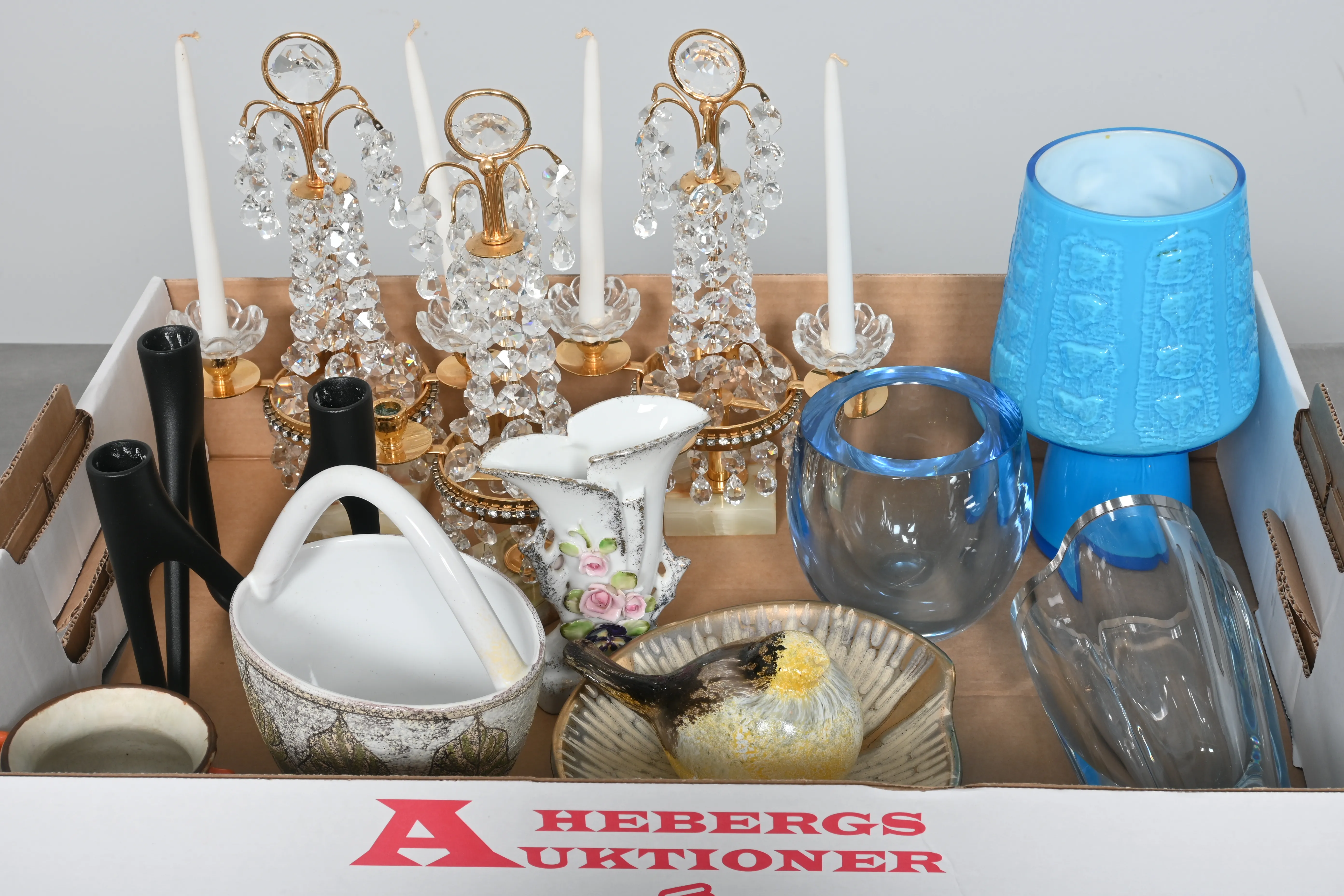 Visning: Torsdag 26/3 Kl 16-19 Lördag 28/3 11-14. Utlämning Söndag 29/3 ca 13:15 till 19:30 Måndag 30/3 8-12 och 14-18 Tisdag 31/3 8-12 och 14-16____________________________________________________________________________________________________________________________________________________________________________________________________________- Lägsta möjliga bud är 100 kr. På alla klubbade priser tillkommer Köparprovision 10% och slagavgift på 40 kr per objekt (inklusive moms). Vissa konstföremål kan vara belagda med konstnärsavgift, s.k. Droit de Suite eller följerätt. Betalning och avhämtning av inropade objekt måste ske söndag eller måndagen efter auktionen. Magasineringsavgift kan tillkomma på föremål som inte avhämtas inom angiven tid. Föremål som är betalda och inte hämtade inom två månader skänkes till Lions eller säljes, överskottet efter lagringskostnad skänks till välgörande ändamål. Föremål som säljs på auktion är begagnade och säljs i befintligt skick. Det ankommer på köparen att undersöka föremålen och förvissa sig om skicket. Betalning Du kan betala med kort på "Mina Sidor" via din internetbank, eller med Swish, ange alltid kundnummer. Objektsbeskrivning Objektens beskrivning återspeglar Hebergs Auktioner uppfattning om objekten. Hebergs Auktioner ansvarar inte för skador som förbigåtts vid besiktningen. Hebergs Auktioner ansvarar inte för eventuella felaktigheter i katalogtexten. Bilder i katalogen är till för identifierings- syfte och återspeglar inte nödvändigtvis objektens kondition. Ändringar i katalogtext kan förekomma efter att katalogen tryckts/publicerats. Sent inkomna ändringar meddelas muntligen vid försäljningstillfället. Ur och tekniska föremål säljs som samlarföremål och Hebergs Auktioner kan inte garantera att de är i fungerande skick. Köparens undersökningsplikt gäller. Om Hebergs Auktioner efter begäran från köparen har lämnat en konditionsrapport om ett föremåls kondition skall uppgifterna endast behandlas som vägledning för köparen och befriar inte köparen från dennes undersökningsplikt. Lagen om 14 dagars ångerrätt vid auktionsköp gäller inte här där du har möjlighet att lämna bud på plats. Det framgår av distans- och hemförsäljningslagen ___________________________________________________________________________________________________________________________________________________________________________________________________________________________ Vi kan skicka mindre föremål som inte är ömtåliga med postnord det är postnords prislista över disk som gäller plus moms. Vi skickar inga möbler, tavlor, porslinsföremål, glasföremål m.m