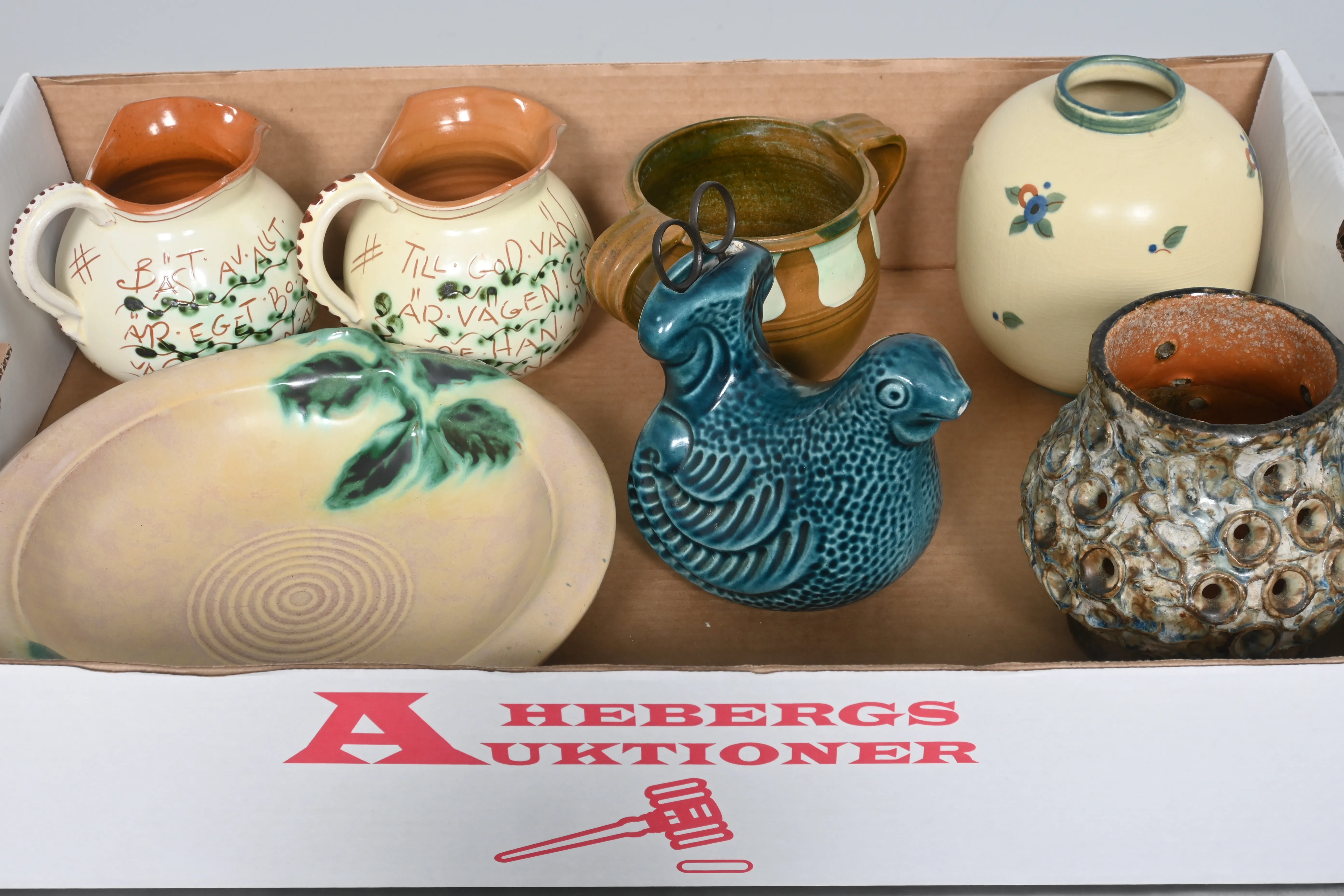 ____________________________________________________________________________________________________________________________________________________________________________________________________________- Lägsta möjliga bud är 100 kr. På alla klubbade priser tillkommer Köparprovision 10% och slagavgift på 40 kr per objekt (inklusive moms). Vissa konstföremål kan vara belagda med konstnärsavgift, s.k. Droit de Suite eller följerätt. Betalning och avhämtning av inropade objekt måste ske söndag eller måndagen efter auktionen. Magasineringsavgift kan tillkomma på föremål som inte avhämtas inom angiven tid. Föremål som är betalda och inte hämtade inom två månader skänkes till Lions eller säljes, överskottet efter lagringskostnad skänks till välgörande ändamål. Föremål som säljs på auktion är begagnade och säljs i befintligt skick. Det ankommer på köparen att undersöka föremålen och förvissa sig om skicket. Betalning Du kan betala med kort på "Mina Sidor" via din internetbank, eller med Swish, ange alltid kundnummer. Objektsbeskrivning Objektens beskrivning återspeglar Hebergs Auktioner uppfattning om objekten. Hebergs Auktioner ansvarar inte för skador som förbigåtts vid besiktningen. Hebergs Auktioner ansvarar inte för eventuella felaktigheter i katalogtexten. Bilder i katalogen är till för identifierings- syfte och återspeglar inte nödvändigtvis objektens kondition. Ändringar i katalogtext kan förekomma efter att katalogen tryckts/publicerats. Sent inkomna ändringar meddelas muntligen vid försäljningstillfället. Ur och tekniska föremål säljs som samlarföremål och Hebergs Auktioner kan inte garantera att de är i fungerande skick. Köparens undersökningsplikt gäller. Om Hebergs Auktioner efter begäran från köparen har lämnat en konditionsrapport om ett föremåls kondition skall uppgifterna endast behandlas som vägledning för köparen och befriar inte köparen från dennes undersökningsplikt. Lagen om 14 dagars ångerrätt vid auktionsköp gäller inte här där du har möjlighet att lämna bud på plats. Det framgår av distans- och hemförsäljningslagen ___________________________________________________________________________________________________________________________________________________________________________________________________________________________ Vi kan skicka mindre föremål som inte är ömtåliga med postnord det är postnords prislista över disk som gäller plus moms. Vi skickar inga möbler, tavlor, porslinsföremål, glasföremål m.m