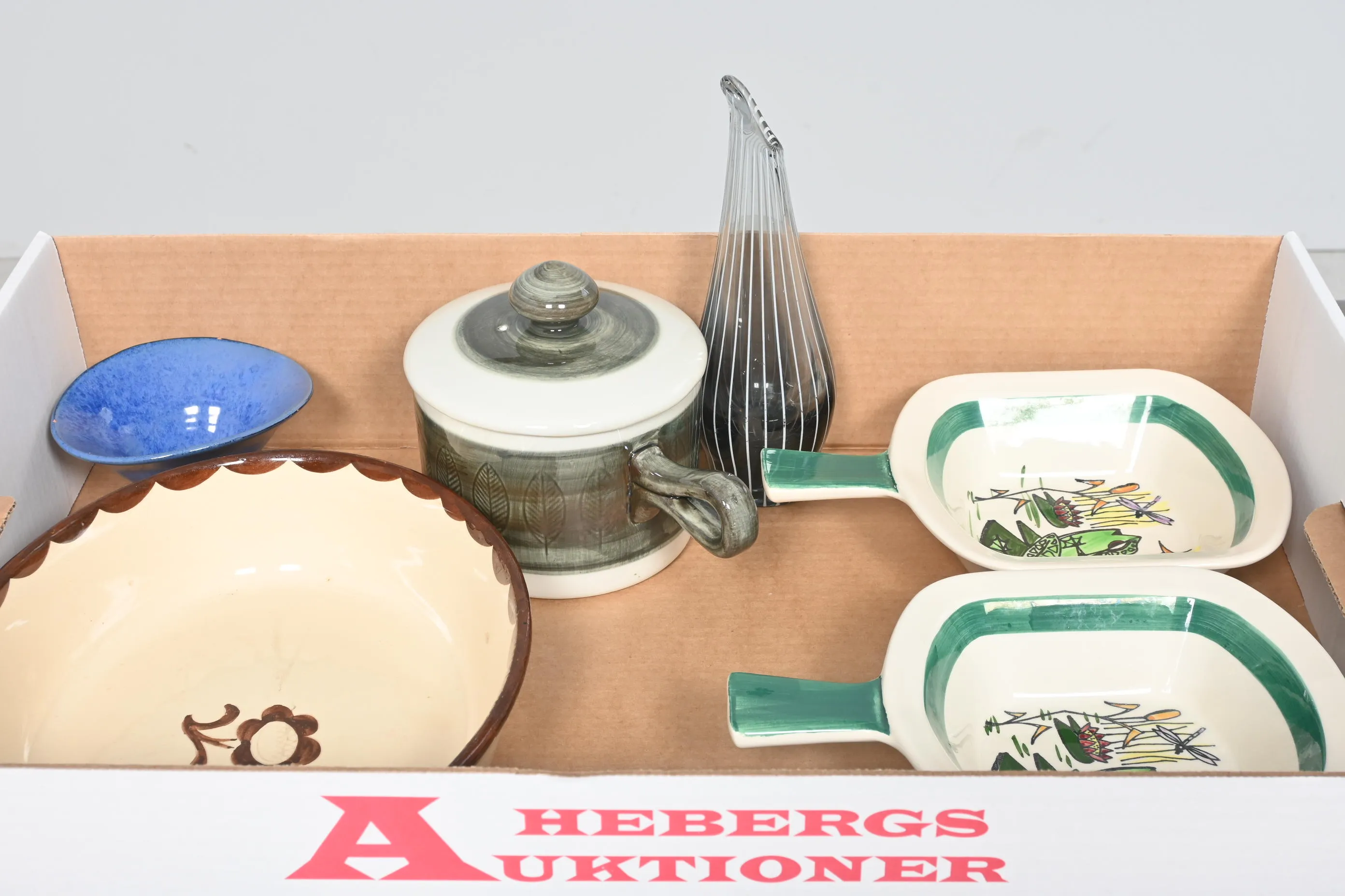 ____________________________________________________________________________________________________________________________________________________________________________________________________________- Lägsta möjliga bud är 100 kr. På alla klubbade priser tillkommer Köparprovision 10% och slagavgift på 40 kr per objekt (inklusive moms). Vissa konstföremål kan vara belagda med konstnärsavgift, s.k. Droit de Suite eller följerätt. Betalning och avhämtning av inropade objekt måste ske söndag eller måndagen efter auktionen. Magasineringsavgift kan tillkomma på föremål som inte avhämtas inom angiven tid. Föremål som är betalda och inte hämtade inom två månader skänkes till Lions eller säljes, överskottet efter lagringskostnad skänks till välgörande ändamål. Föremål som säljs på auktion är begagnade och säljs i befintligt skick. Det ankommer på köparen att undersöka föremålen och förvissa sig om skicket. Betalning Du kan betala med kort på "Mina Sidor" via din internetbank, eller med Swish, ange alltid kundnummer. Objektsbeskrivning Objektens beskrivning återspeglar Hebergs Auktioner uppfattning om objekten. Hebergs Auktioner ansvarar inte för skador som förbigåtts vid besiktningen. Hebergs Auktioner ansvarar inte för eventuella felaktigheter i katalogtexten. Bilder i katalogen är till för identifierings- syfte och återspeglar inte nödvändigtvis objektens kondition. Ändringar i katalogtext kan förekomma efter att katalogen tryckts/publicerats. Sent inkomna ändringar meddelas muntligen vid försäljningstillfället. Ur och tekniska föremål säljs som samlarföremål och Hebergs Auktioner kan inte garantera att de är i fungerande skick. Köparens undersökningsplikt gäller. Om Hebergs Auktioner efter begäran från köparen har lämnat en konditionsrapport om ett föremåls kondition skall uppgifterna endast behandlas som vägledning för köparen och befriar inte köparen från dennes undersökningsplikt. Lagen om 14 dagars ångerrätt vid auktionsköp gäller inte här där du har möjlighet att lämna bud på plats. Det framgår av distans- och hemförsäljningslagen ___________________________________________________________________________________________________________________________________________________________________________________________________________________________ Vi kan skicka mindre föremål som inte är ömtåliga med postnord det är postnords prislista över disk som gäller plus moms. Vi skickar inga möbler, tavlor, porslinsföremål, glasföremål m.m
