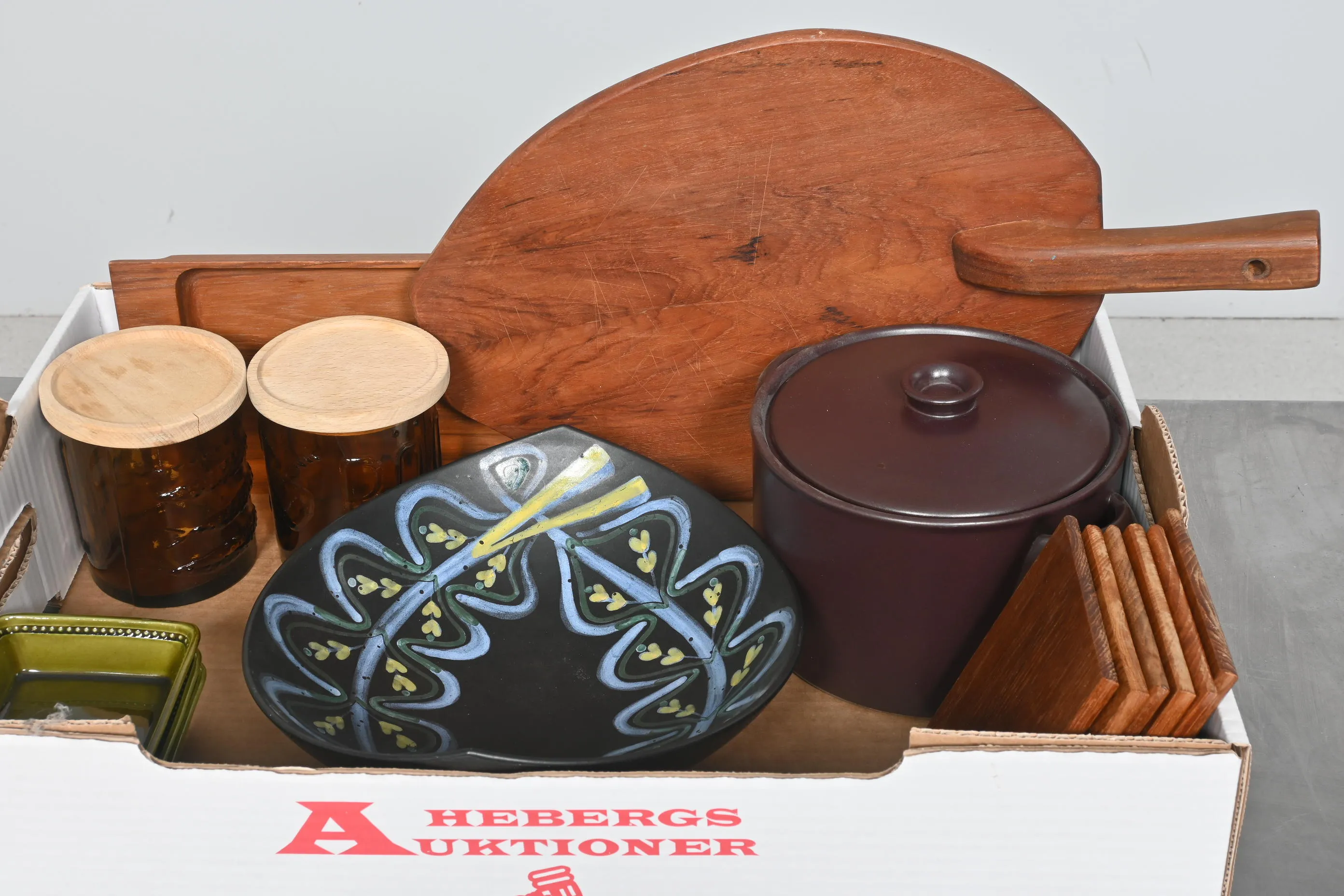 Visning: Torsdag 21/5 Kl 16-19 Lördag 23/5 11-14. Utlämning Söndag 24/5 ca 13:15 till 19:30 Måndag 25/5 8-12 och 14-18 Tisdag 26/5 8-12 och 14-16____________________________________________________________________________________________________________________________________________________________________________________________________________- Lägsta möjliga bud är 100 kr. På alla klubbade priser tillkommer Köparprovision 10% och slagavgift på 40 kr per objekt (inklusive moms). Vissa konstföremål kan vara belagda med konstnärsavgift, s.k. Droit de Suite eller följerätt. Betalning och avhämtning av inropade objekt måste ske söndag eller måndagen efter auktionen. Magasineringsavgift kan tillkomma på föremål som inte avhämtas inom angiven tid. Föremål som är betalda och inte hämtade inom två månader skänkes till Lions eller säljes, överskottet efter lagringskostnad skänks till välgörande ändamål. Föremål som säljs på auktion är begagnade och säljs i befintligt skick. Det ankommer på köparen att undersöka föremålen och förvissa sig om skicket. Betalning Du kan betala med kort på "Mina Sidor" via din internetbank, eller med Swish, ange alltid kundnummer. Objektsbeskrivning Objektens beskrivning återspeglar Hebergs Auktioner uppfattning om objekten. Hebergs Auktioner ansvarar inte för skador som förbigåtts vid besiktningen. Hebergs Auktioner ansvarar inte för eventuella felaktigheter i katalogtexten. Bilder i katalogen är till för identifierings- syfte och återspeglar inte nödvändigtvis objektens kondition. Ändringar i katalogtext kan förekomma efter att katalogen tryckts/publicerats. Sent inkomna ändringar meddelas muntligen vid försäljningstillfället. Ur och tekniska föremål säljs som samlarföremål och Hebergs Auktioner kan inte garantera att de är i fungerande skick. Köparens undersökningsplikt gäller. Om Hebergs Auktioner efter begäran från köparen har lämnat en konditionsrapport om ett föremåls kondition skall uppgifterna endast behandlas som vägledning för köparen och befriar inte köparen från dennes undersökningsplikt. Lagen om 14 dagars ångerrätt vid auktionsköp gäller inte här där du har möjlighet att lämna bud på plats. Det framgår av distans- och hemförsäljningslagen ___________________________________________________________________________________________________________________________________________________________________________________________________________________________ Vi kan skicka mindre föremål som inte är ömtåliga med postnord det är postnords prislista över disk som gäller plus moms. Vi skickar inga möbler, tavlor, porslinsföremål, glasföremål m.m