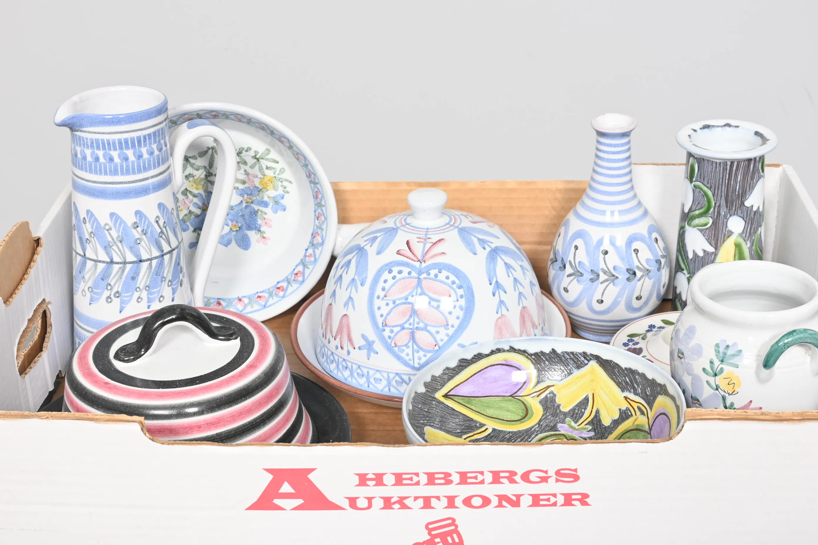Visning: Torsdag 21/5 Kl 16-19 Lördag 23/5 11-14. Utlämning Söndag 24/5 ca 13:15 till 19:30 Måndag 25/5 8-12 och 14-18 Tisdag 26/5 8-12 och 14-16____________________________________________________________________________________________________________________________________________________________________________________________________________- Lägsta möjliga bud är 100 kr. På alla klubbade priser tillkommer Köparprovision 10% och slagavgift på 40 kr per objekt (inklusive moms). Vissa konstföremål kan vara belagda med konstnärsavgift, s.k. Droit de Suite eller följerätt. Betalning och avhämtning av inropade objekt måste ske söndag eller måndagen efter auktionen. Magasineringsavgift kan tillkomma på föremål som inte avhämtas inom angiven tid. Föremål som är betalda och inte hämtade inom två månader skänkes till Lions eller säljes, överskottet efter lagringskostnad skänks till välgörande ändamål. Föremål som säljs på auktion är begagnade och säljs i befintligt skick. Det ankommer på köparen att undersöka föremålen och förvissa sig om skicket. Betalning Du kan betala med kort på "Mina Sidor" via din internetbank, eller med Swish, ange alltid kundnummer. Objektsbeskrivning Objektens beskrivning återspeglar Hebergs Auktioner uppfattning om objekten. Hebergs Auktioner ansvarar inte för skador som förbigåtts vid besiktningen. Hebergs Auktioner ansvarar inte för eventuella felaktigheter i katalogtexten. Bilder i katalogen är till för identifierings- syfte och återspeglar inte nödvändigtvis objektens kondition. Ändringar i katalogtext kan förekomma efter att katalogen tryckts/publicerats. Sent inkomna ändringar meddelas muntligen vid försäljningstillfället. Ur och tekniska föremål säljs som samlarföremål och Hebergs Auktioner kan inte garantera att de är i fungerande skick. Köparens undersökningsplikt gäller. Om Hebergs Auktioner efter begäran från köparen har lämnat en konditionsrapport om ett föremåls kondition skall uppgifterna endast behandlas som vägledning för köparen och befriar inte köparen från dennes undersökningsplikt. Lagen om 14 dagars ångerrätt vid auktionsköp gäller inte här där du har möjlighet att lämna bud på plats. Det framgår av distans- och hemförsäljningslagen ___________________________________________________________________________________________________________________________________________________________________________________________________________________________ Vi kan skicka mindre föremål som inte är ömtåliga med postnord det är postnords prislista över disk som gäller plus moms. Vi skickar inga möbler, tavlor, porslinsföremål, glasföremål m.m