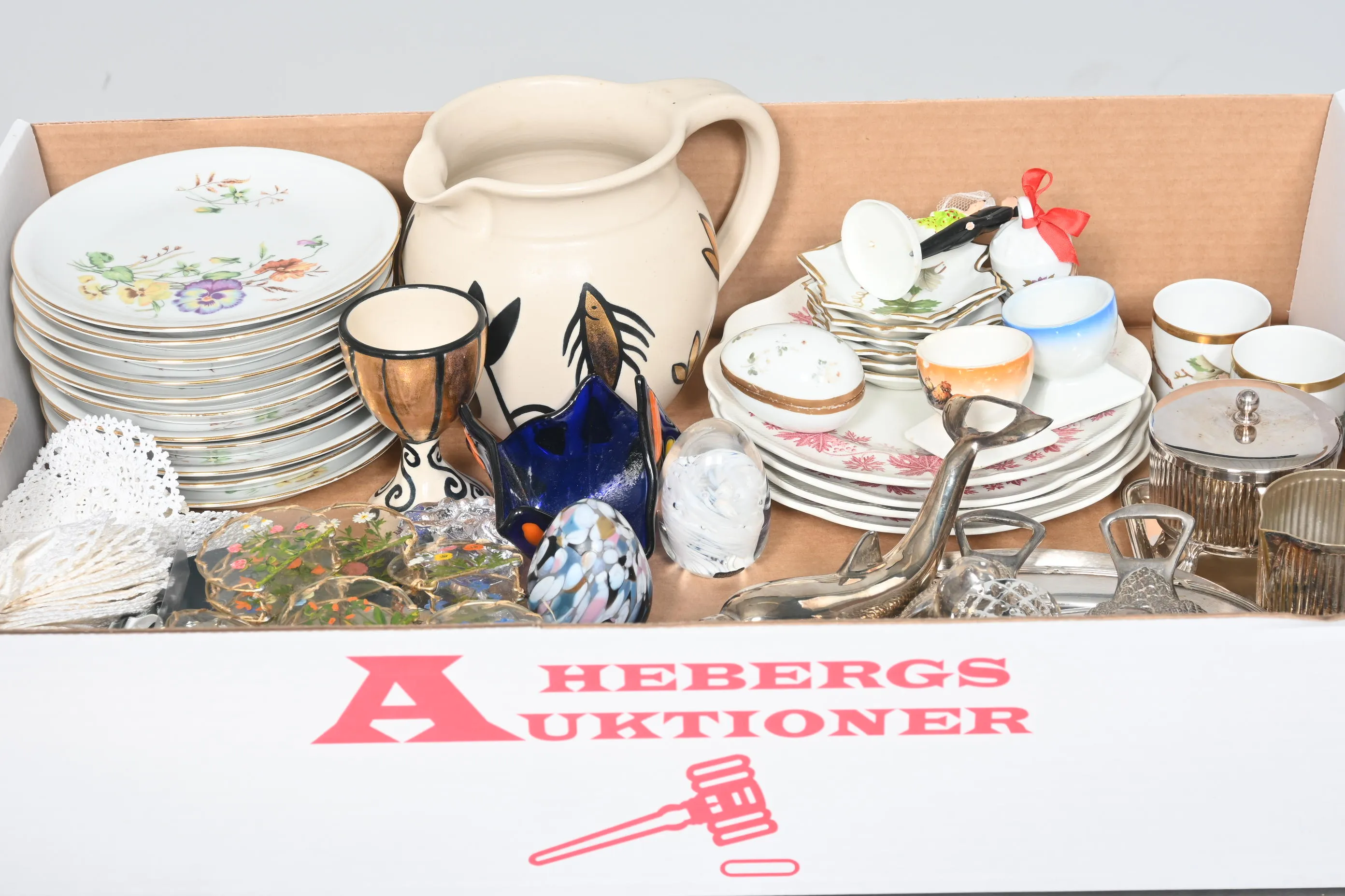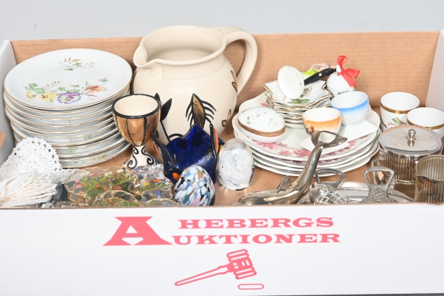 ____________________________________________________________________________________________________________________________________________________________________________________________________________- Lägsta möjliga bud är 100 kr. På alla klubbade priser tillkommer Köparprovision 10% och slagavgift på 40 kr per objekt (inklusive moms). Vissa konstföremål kan vara belagda med konstnärsavgift, s.k. Droit de Suite eller följerätt. Betalning och avhämtning av inropade objekt måste ske söndag eller måndagen efter auktionen. Magasineringsavgift kan tillkomma på föremål som inte avhämtas inom angiven tid. Föremål som är betalda och inte hämtade inom två månader skänkes till Lions eller säljes, överskottet efter lagringskostnad skänks till välgörande ändamål. Föremål som säljs på auktion är begagnade och säljs i befintligt skick. Det ankommer på köparen att undersöka föremålen och förvissa sig om skicket. Betalning Du kan betala med kort på "Mina Sidor" via din internetbank, eller med Swish, ange alltid kundnummer. Objektsbeskrivning Objektens beskrivning återspeglar Hebergs Auktioner uppfattning om objekten. Hebergs Auktioner ansvarar inte för skador som förbigåtts vid besiktningen. Hebergs Auktioner ansvarar inte för eventuella felaktigheter i katalogtexten. Bilder i katalogen är till för identifierings- syfte och återspeglar inte nödvändigtvis objektens kondition. Ändringar i katalogtext kan förekomma efter att katalogen tryckts/publicerats. Sent inkomna ändringar meddelas muntligen vid försäljningstillfället. Ur och tekniska föremål säljs som samlarföremål och Hebergs Auktioner kan inte garantera att de är i fungerande skick. Köparens undersökningsplikt gäller. Om Hebergs Auktioner efter begäran från köparen har lämnat en konditionsrapport om ett föremåls kondition skall uppgifterna endast behandlas som vägledning för köparen och befriar inte köparen från dennes undersökningsplikt. Lagen om 14 dagars ångerrätt vid auktionsköp gäller inte här där du har möjlighet att lämna bud på plats. Det framgår av distans- och hemförsäljningslagen ___________________________________________________________________________________________________________________________________________________________________________________________________________________________ Vi kan skicka mindre föremål som inte är ömtåliga med postnord det är postnords prislista över disk som gäller plus moms. Vi skickar inga möbler, tavlor, porslinsföremål, glasföremål m.m
