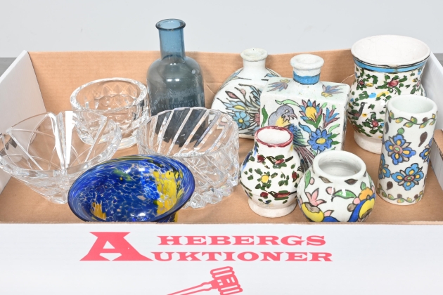 Visning: Torsdag 21/5 Kl 16-19 Lördag 23/5 11-14. Utlämning Söndag 24/5 ca 13:15 till 19:30 Måndag 25/5 8-12 och 14-18 Tisdag 26/5 8-12 och 14-16____________________________________________________________________________________________________________________________________________________________________________________________________________- Lägsta möjliga bud är 100 kr. På alla klubbade priser tillkommer Köparprovision 10% och slagavgift på 40 kr per objekt (inklusive moms). Vissa konstföremål kan vara belagda med konstnärsavgift, s.k. Droit de Suite eller följerätt. Betalning och avhämtning av inropade objekt måste ske söndag eller måndagen efter auktionen. Magasineringsavgift kan tillkomma på föremål som inte avhämtas inom angiven tid. Föremål som är betalda och inte hämtade inom två månader skänkes till Lions eller säljes, överskottet efter lagringskostnad skänks till välgörande ändamål. Föremål som säljs på auktion är begagnade och säljs i befintligt skick. Det ankommer på köparen att undersöka föremålen och förvissa sig om skicket. Betalning Du kan betala med kort på "Mina Sidor" via din internetbank, eller med Swish, ange alltid kundnummer. Objektsbeskrivning Objektens beskrivning återspeglar Hebergs Auktioner uppfattning om objekten. Hebergs Auktioner ansvarar inte för skador som förbigåtts vid besiktningen. Hebergs Auktioner ansvarar inte för eventuella felaktigheter i katalogtexten. Bilder i katalogen är till för identifierings- syfte och återspeglar inte nödvändigtvis objektens kondition. Ändringar i katalogtext kan förekomma efter att katalogen tryckts/publicerats. Sent inkomna ändringar meddelas muntligen vid försäljningstillfället. Ur och tekniska föremål säljs som samlarföremål och Hebergs Auktioner kan inte garantera att de är i fungerande skick. Köparens undersökningsplikt gäller. Om Hebergs Auktioner efter begäran från köparen har lämnat en konditionsrapport om ett föremåls kondition skall uppgifterna endast behandlas som vägledning för köparen och befriar inte köparen från dennes undersökningsplikt. Lagen om 14 dagars ångerrätt vid auktionsköp gäller inte här där du har möjlighet att lämna bud på plats. Det framgår av distans- och hemförsäljningslagen ___________________________________________________________________________________________________________________________________________________________________________________________________________________________ Vi kan skicka mindre föremål som inte är ömtåliga med postnord det är postnords prislista över disk som gäller plus moms. Vi skickar inga möbler, tavlor, porslinsföremål, glasföremål m.m