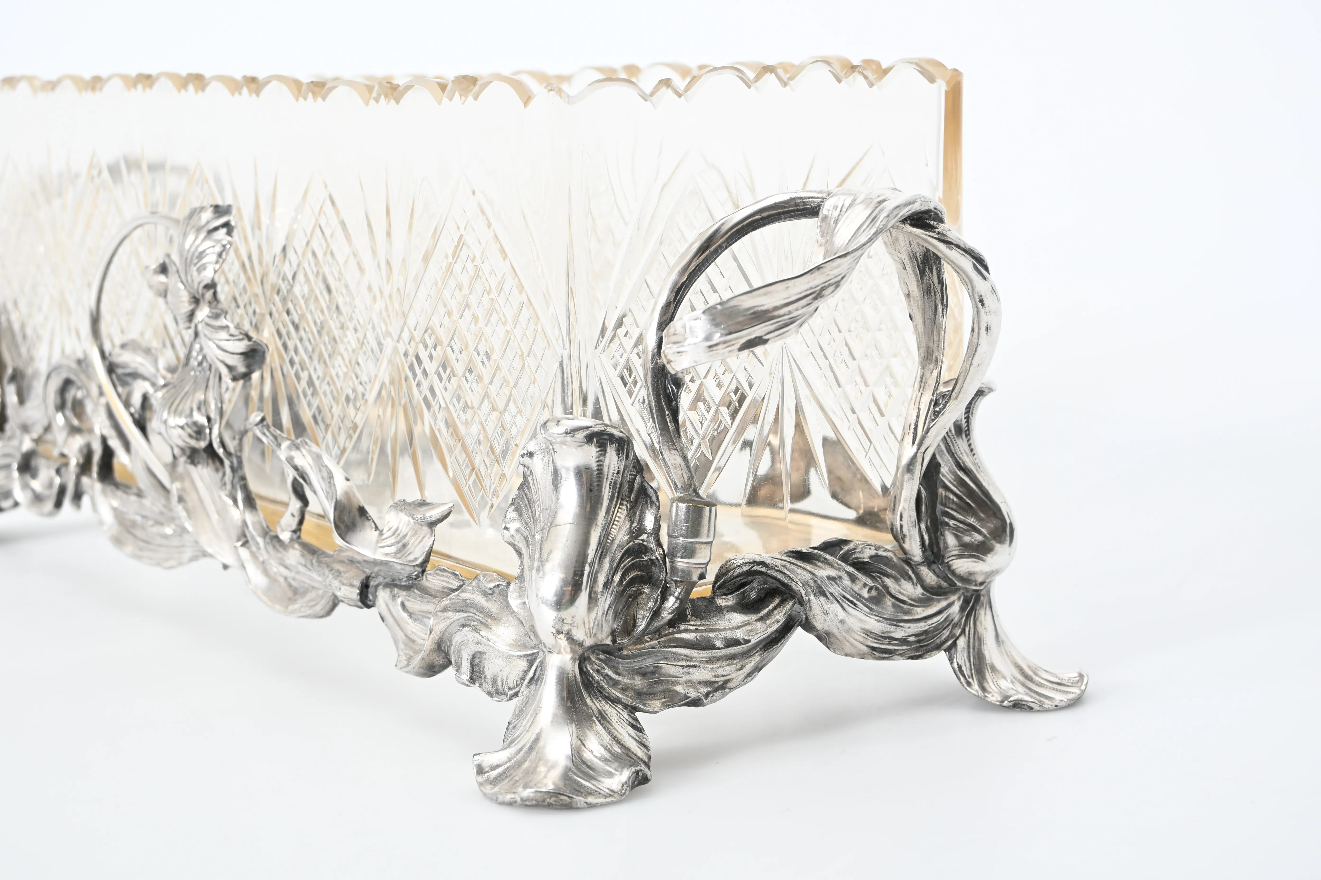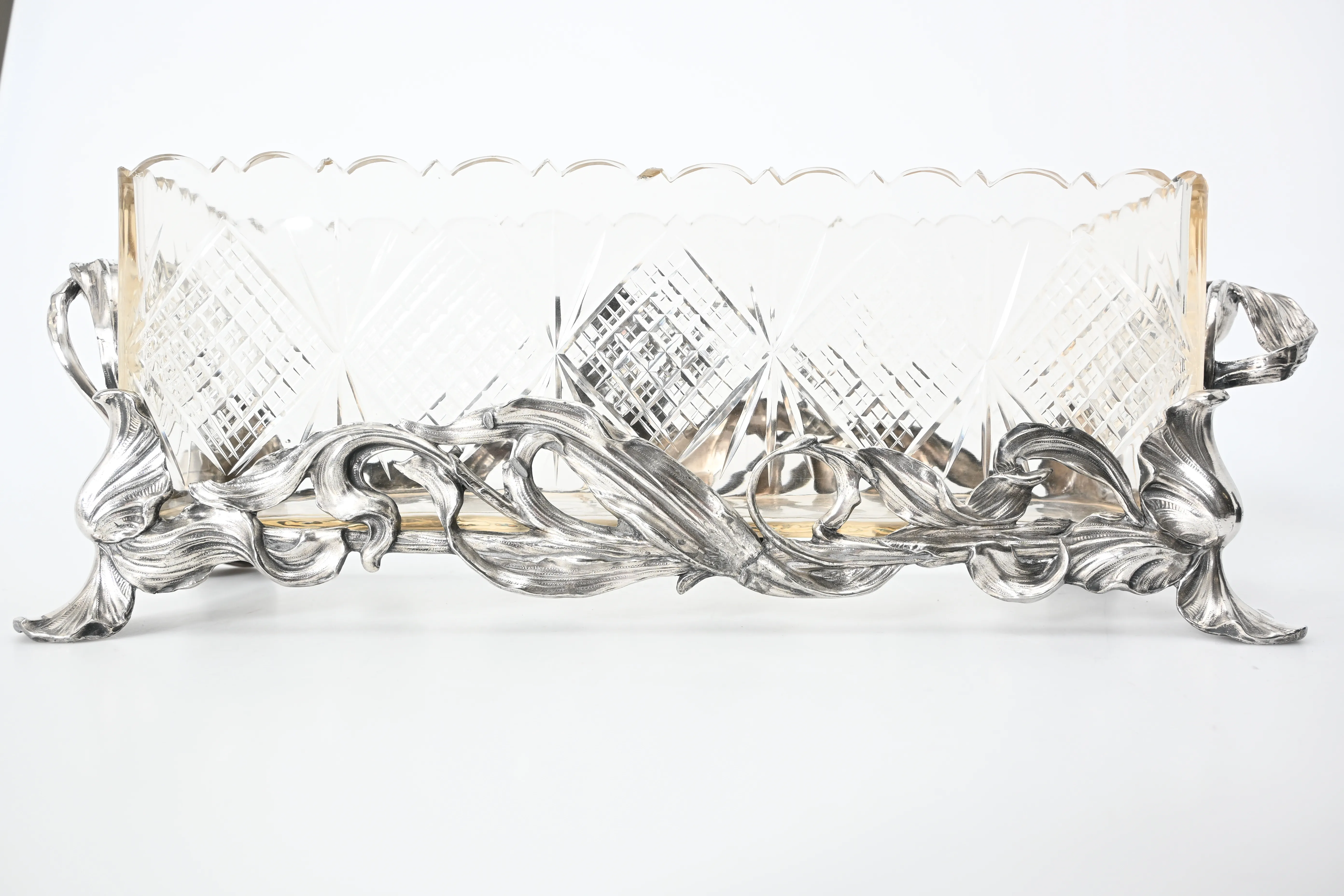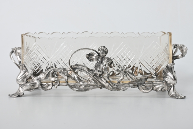 Vitmetall, glasinsats med slipad dekor, 39.5x13.5 cm, totallängd 50 cm, höjd 16 cm, en hänkel med lagning