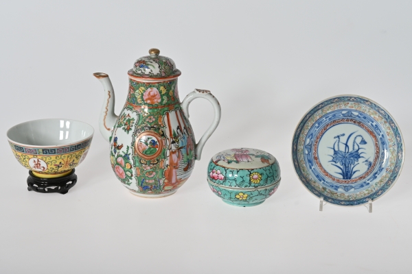 Kantonkanna, fat med skrivtecken i botten, lock ask och skål på träsockel, höjd 6.5-19.5 cm, diameter 10-14.5 cm