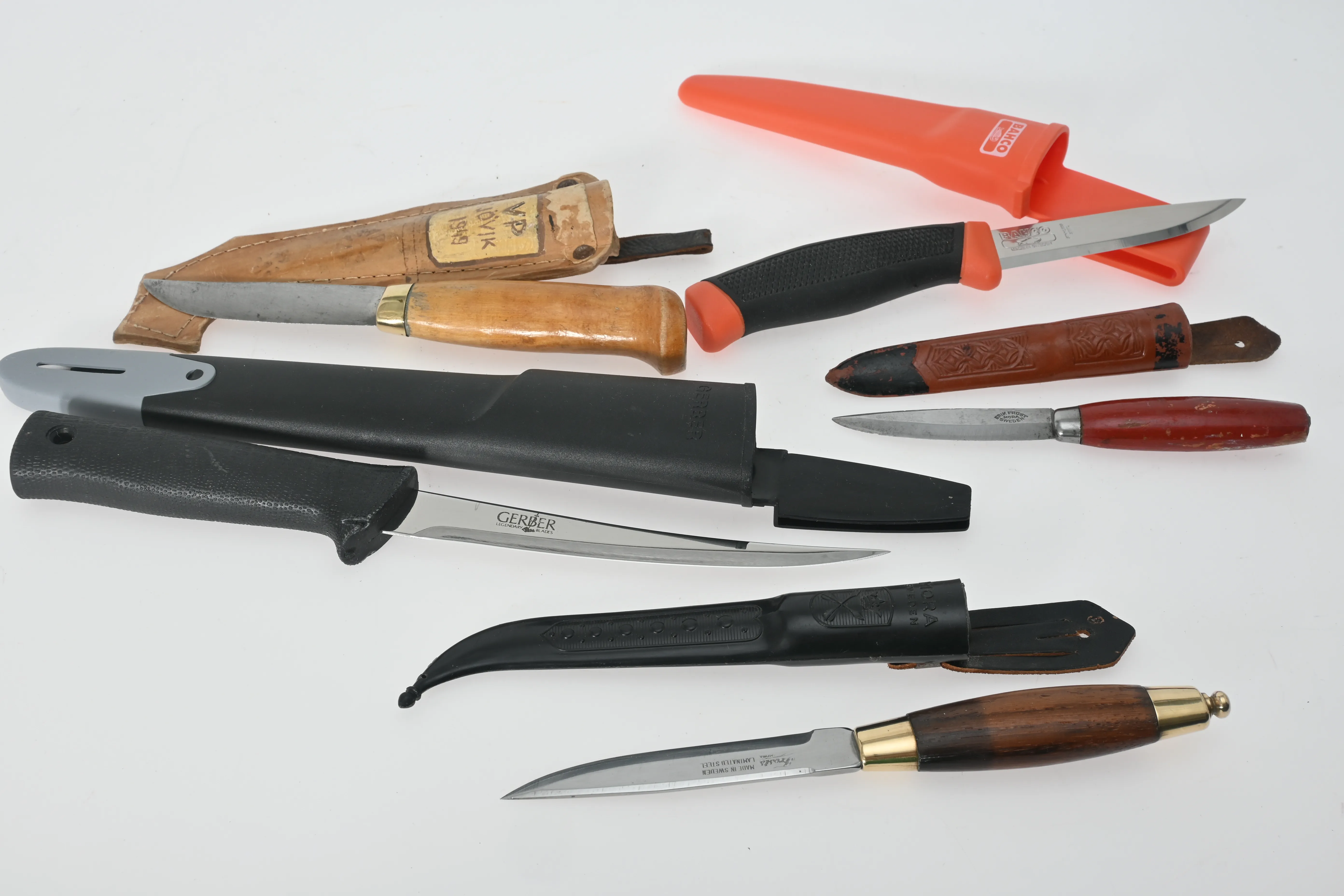5 st knivar, Matti Klemola Kauhava, 2st Frosts Mora, Gerber Fundia filét, Bahco, längsta längd 32.5 cm