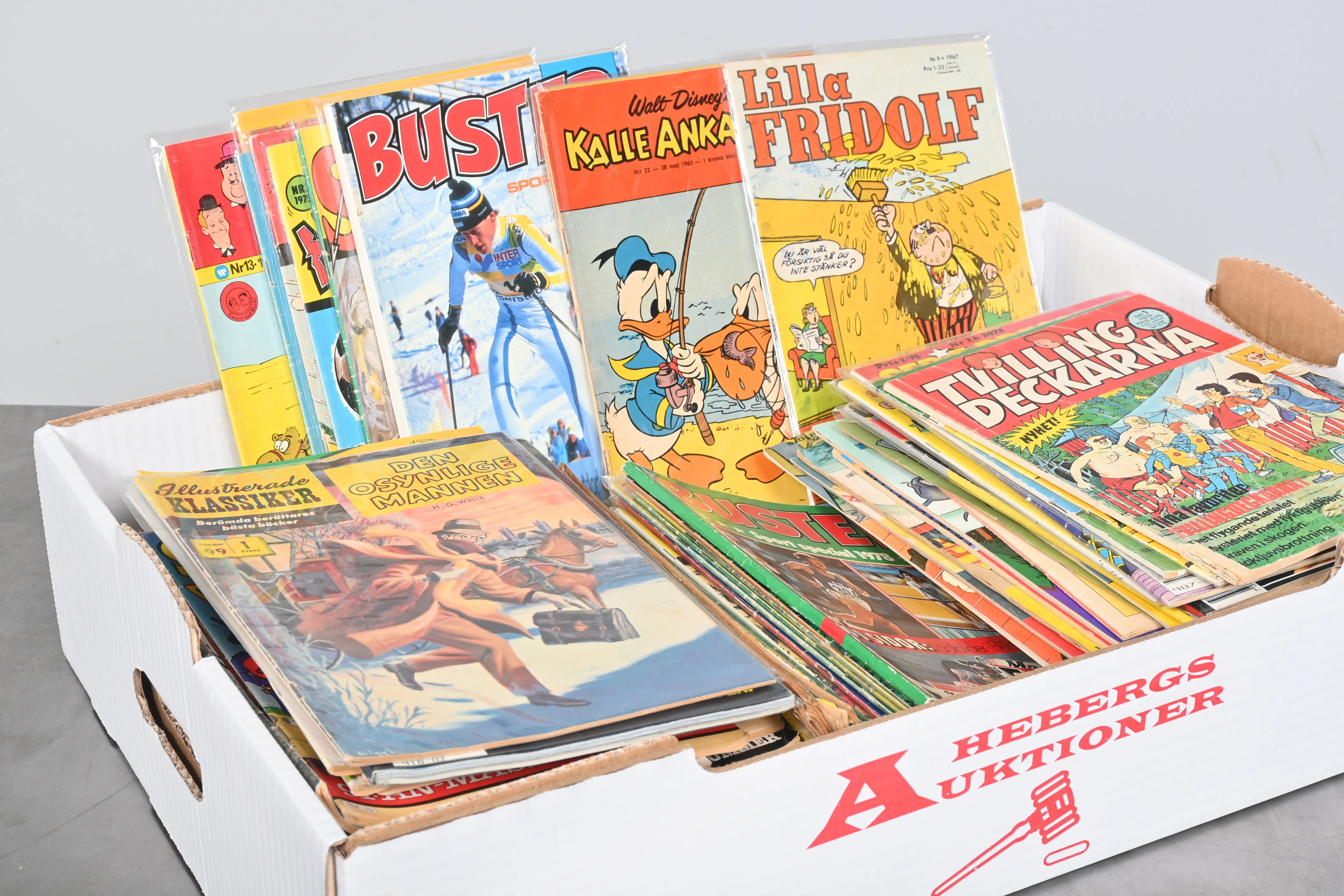 Visning: Torsdag 25/9 Kl 16-19 Lördag 27/9 11-14. Utlämning Söndag 28/9 13:00 till 19:30 Måndag 29/9 8-12 och 14-18 Tisdag 30/9 8-12 och 14-16____________________________________________________________________________________________________________________________________________________________________________________________________________- Lägsta möjliga bud är 100 kr. På alla klubbade priser tillkommer Köparprovision 10% och slagavgift på 40 kr per objekt (inklusive moms). Vissa konstföremål kan vara belagda med konstnärsavgift, s.k. Droit de Suite eller följerätt. Betalning och avhämtning av inropade objekt måste ske söndag eller måndagen efter auktionen. Magasineringsavgift kan tillkomma på föremål som inte avhämtas inom angiven tid. Föremål som är betalda och inte hämtade inom två månader skänkes till Lions eller säljes, överskottet efter lagringskostnad skänks till välgörande ändamål. Föremål som säljs på auktion är begagnade och säljs i befintligt skick. Det ankommer på köparen att undersöka föremålen och förvissa sig om skicket. Betalning Du kan betala med kort på "Mina Sidor" via din internetbank, eller med Swish, ange alltid kundnummer. Objektsbeskrivning Objektens beskrivning återspeglar Hebergs Auktioner uppfattning om objekten. Hebergs Auktioner ansvarar inte för skador som förbigåtts vid besiktningen. Hebergs Auktioner ansvarar inte för eventuella felaktigheter i katalogtexten. Bilder i katalogen är till för identifierings- syfte och återspeglar inte nödvändigtvis objektens kondition. Ändringar i katalogtext kan förekomma efter att katalogen tryckts/publicerats. Sent inkomna ändringar meddelas muntligen vid försäljningstillfället. Ur och tekniska föremål säljs som samlarföremål och Hebergs Auktioner kan inte garantera att de är i fungerande skick. Köparens undersökningsplikt gäller. Om Hebergs Auktioner efter begäran från köparen har lämnat en konditionsrapport om ett föremåls kondition skall uppgifterna endast behandlas som vägledning för köparen och befriar inte köparen från dennes undersökningsplikt. Lagen om 14 dagars ångerrätt vid auktionsköp gäller inte här där du har möjlighet att lämna bud på plats. Det framgår av distans- och hemförsäljningslagen ___________________________________________________________________________________________________________________________________________________________________________________________________________________________ Vi kan skicka mindre föremål som inte är ömtåliga med postnord det är postnords prislista över disk som gäller plus moms. Vi skickar inga möbler, tavlor, porslinsföremål, glasföremål m.m