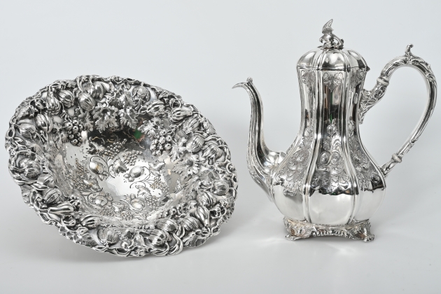 792. Serveringskanna och reliefskål silverplate 1800/1900 tal